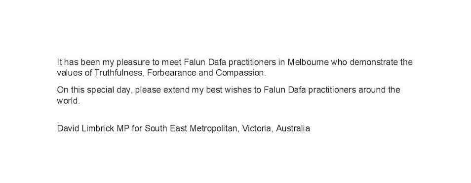 维州自由民主党立法院议员林布里克(David Limbrick MP)先生表示,他非常荣幸能认识墨尔本的法轮大法学员,并说,“他们展现了真、善、忍的价值观。在这个特殊的日子里,请向全世界的法轮大法弟子表达我最美好的祝愿”。