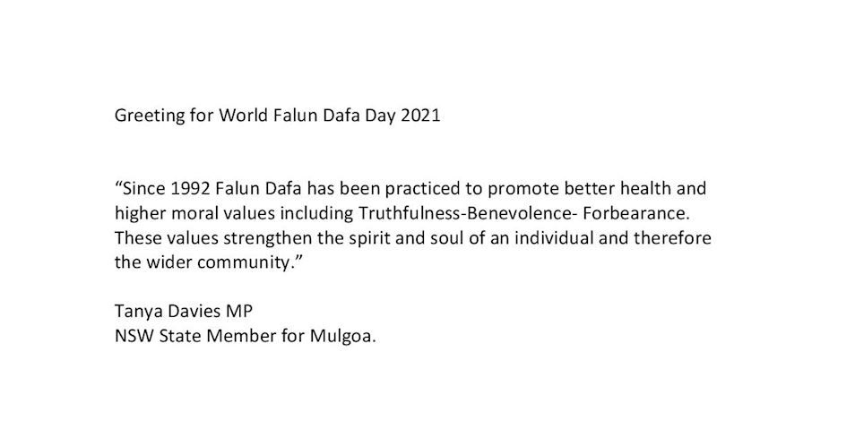 新州自由党州议员戴维斯(Tanya Davies MP)女士在贺信中说: