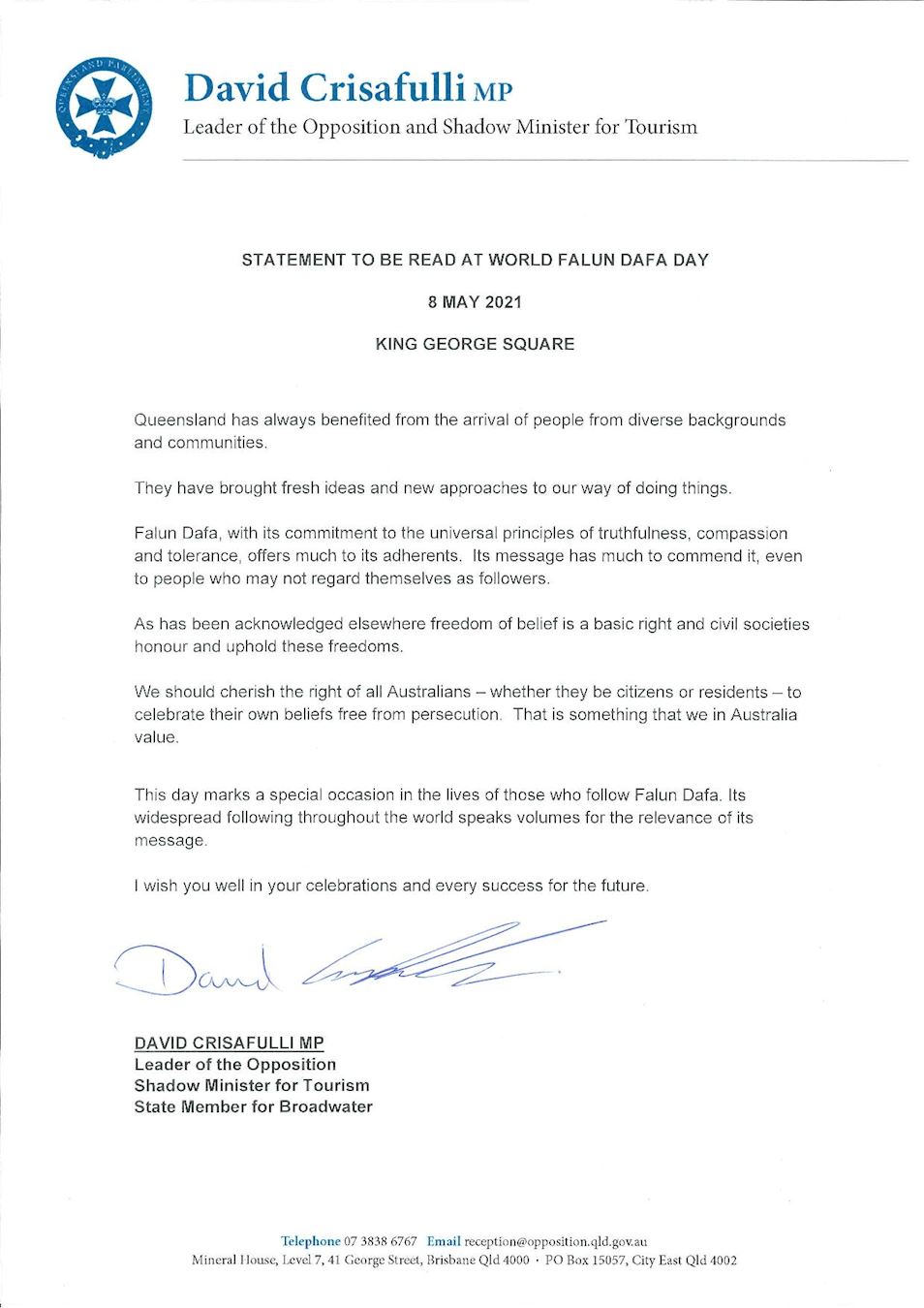 ![]() 图15:昆州州议员、反对党领袖克里斯弗利(David Crisafulli MP)的贺信。 |