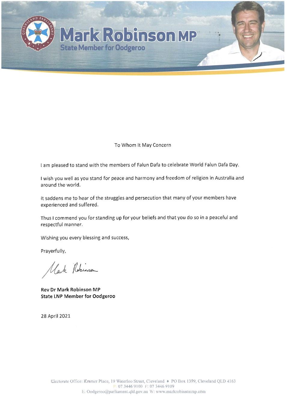 昆州奥哲罗(Oodgeroo)选区自由国家党州议员罗宾逊(Mark Robinson)在贺信中表示,很高兴与法轮大法弟子站在一起,庆祝世界法轮大法日。“我向你们表达美好的祝愿,你们在澳洲,乃至全球代表着和平、和睦以及宗教自由”,“我赞赏你们以和平、尊重的方式捍卫自己的信仰”。