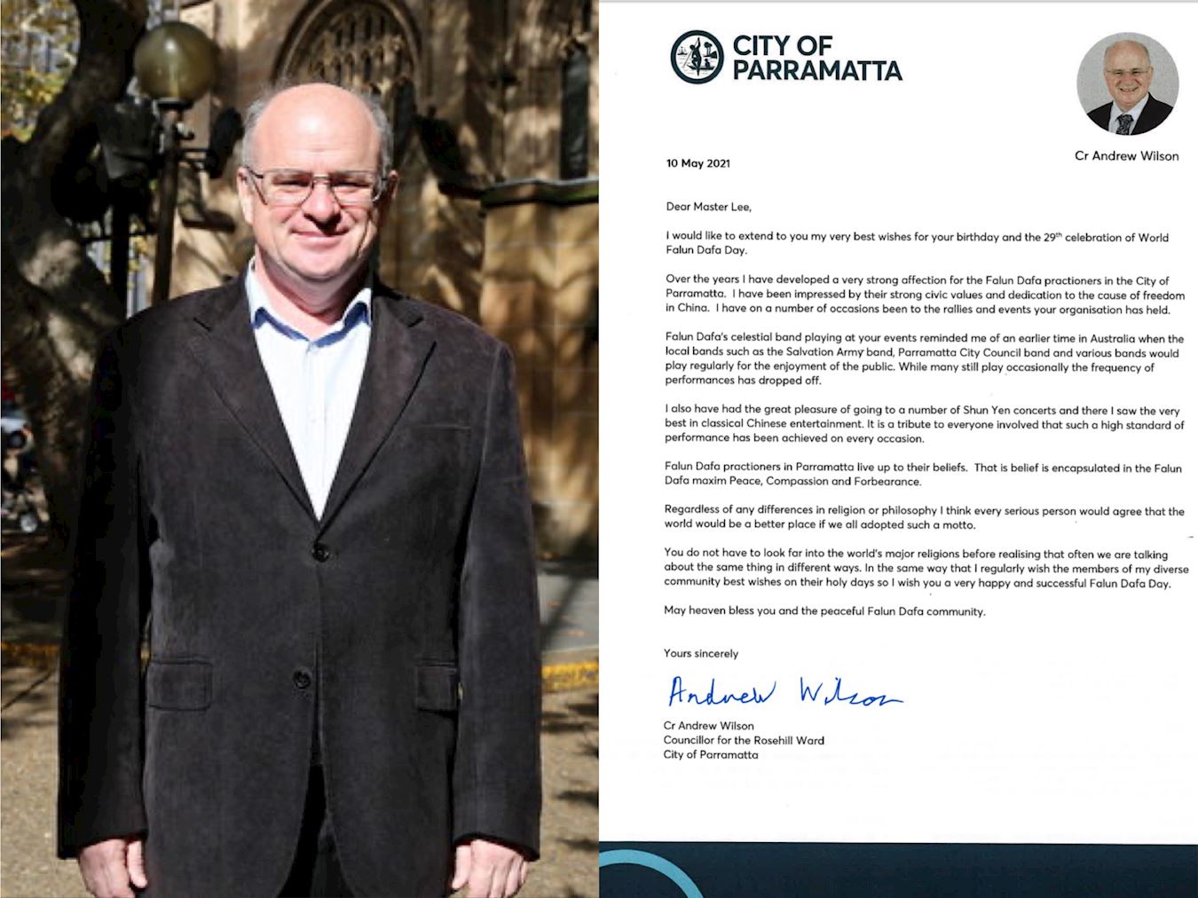 悉尼帕拉马塔(Parramatta)市议员威尔逊(Andrew Wilson)在贺信开头写道,“亲爱的李大师,我想为您的生日和第二十二届世界法轮大法日送上我最美好的祝愿”。
