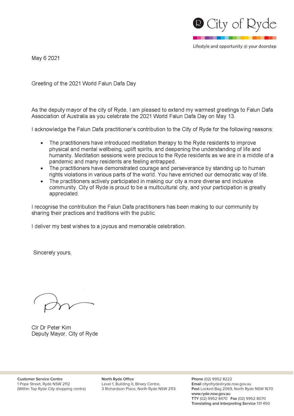 新州莱德(Ryde)市副市长金(Cr Peter Kim)在贺信中说,“我很高兴在庆祝世界法轮大法日之际,向澳洲法轮大法学会致以最热烈的问候”。他还在信中赞扬法轮大法对莱德市的贡献。“法轮功学员向本市居民介绍了打坐,改善身心健康,提升精神境界,加深对生命和人性的理解”,“因为我们正处于大流行疫情中,许多居民感到被困扰,这些教功课程对本市居民来说是非常珍贵的”。