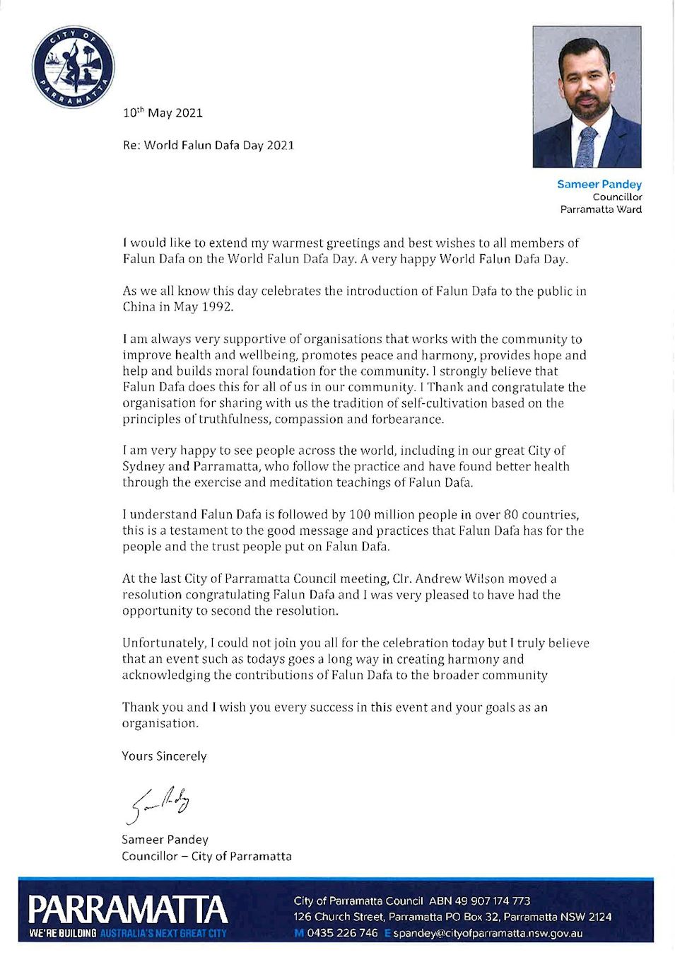 ![]() 图22:悉尼帕拉马塔市议员潘迪(Cr Sameer Pandey)先生的贺信。 |