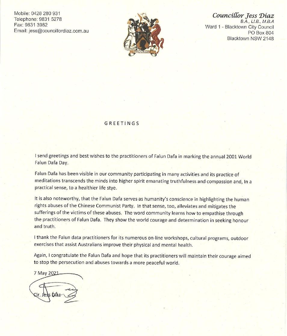 悉尼黑镇(Blacktown)市市议员迪亚兹(Cr Jess Diaz)在贺信中说,法轮大法的修炼使人们的思想升华至更高的精神境界。他说,“法轮大法修炼者向世界展现了追求真理的勇气和决心”,“我感谢他们举办的众多的在线研讨会、文化活动和户外运动,帮助澳洲人改善身心健康。”“我再次祝贺法轮大法,并希望法轮大法修炼者坚持勇气,制止迫害。”