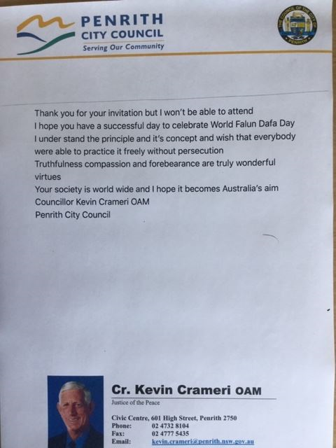 悉尼彭里斯(Penrith)市议员、澳洲勋章得主克拉梅里(Kevin Crameri OAM)先生在贺信中说:“我理解法轮大法的原则和理念,希望每个人都能自由地修炼,不受迫害。”他还表示,真、善、忍是真正美好的价值观,法轮大法修炼人遍及世界,我希望法轮大法也能成为澳洲人学炼的目标。