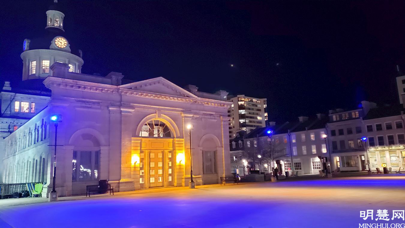 '图5:金斯敦市(Kingston)五月十三日晚市政厅亮彩灯庆祝世界法轮大法日。'