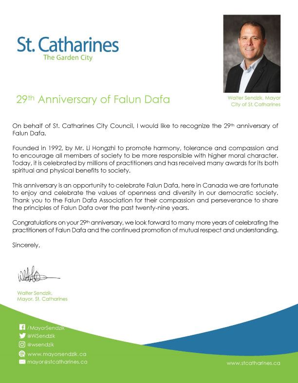 市长沃尔特·森吉克(Walter Sendzik)在贺信中写道:法轮大法由李洪志先生于1992年创立,旨在弘扬平和,宽容和善良,以鼓励全体社会成员以追求道德的高尚为己任。