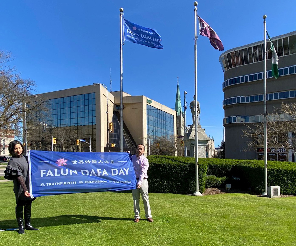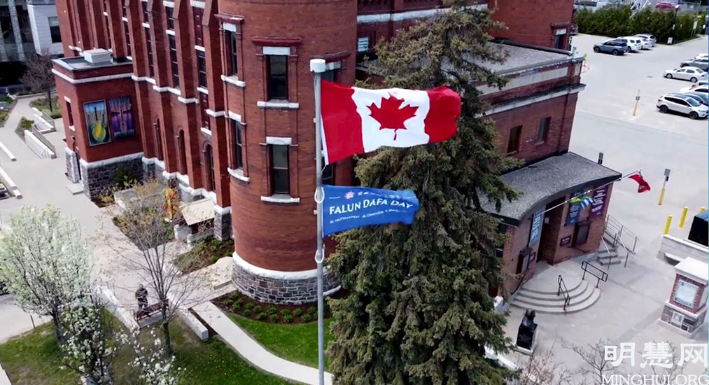 '图3~4:金斯敦市(Kingston)五月十三日在市政厅前升起“世界法轮大法日”的旗帜旗庆祝世界法轮大法日。'