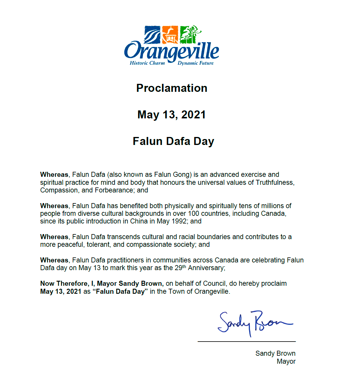 现在,我,桑迪·布朗市长代表市议会特此宣告:2021年5月13日为奥兰治维尔镇的 “法轮大法日”。
