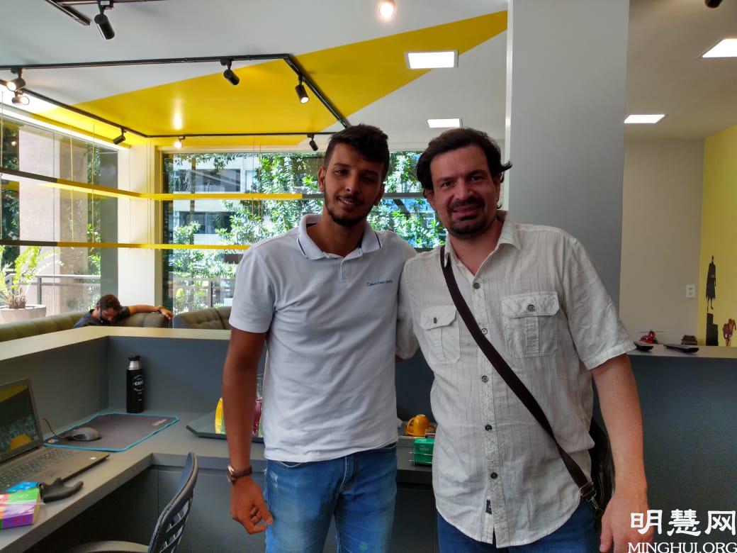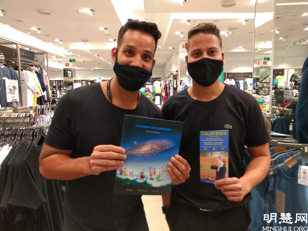 图4:年轻经理Riachuelo服装店经理厚给(Roque)(左)认真听完真相后说:“同化真善忍,提高人们道德太重要了,我非常赞成。”