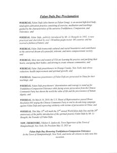鉴于,法轮大法(又称法轮功)超越文化和种族的界限,为建立一个祥和、忍让且更加包容慈善的社会所做出的贡献;法轮大法是上乘性命双修功法,以真、善、忍宇宙特性为中心;他使修炼人能够拥抱美德,并从整体上改善他们的福祉。自1992年5月13日在中国传出以来,已有100多个国家的大约1亿人受益;并且