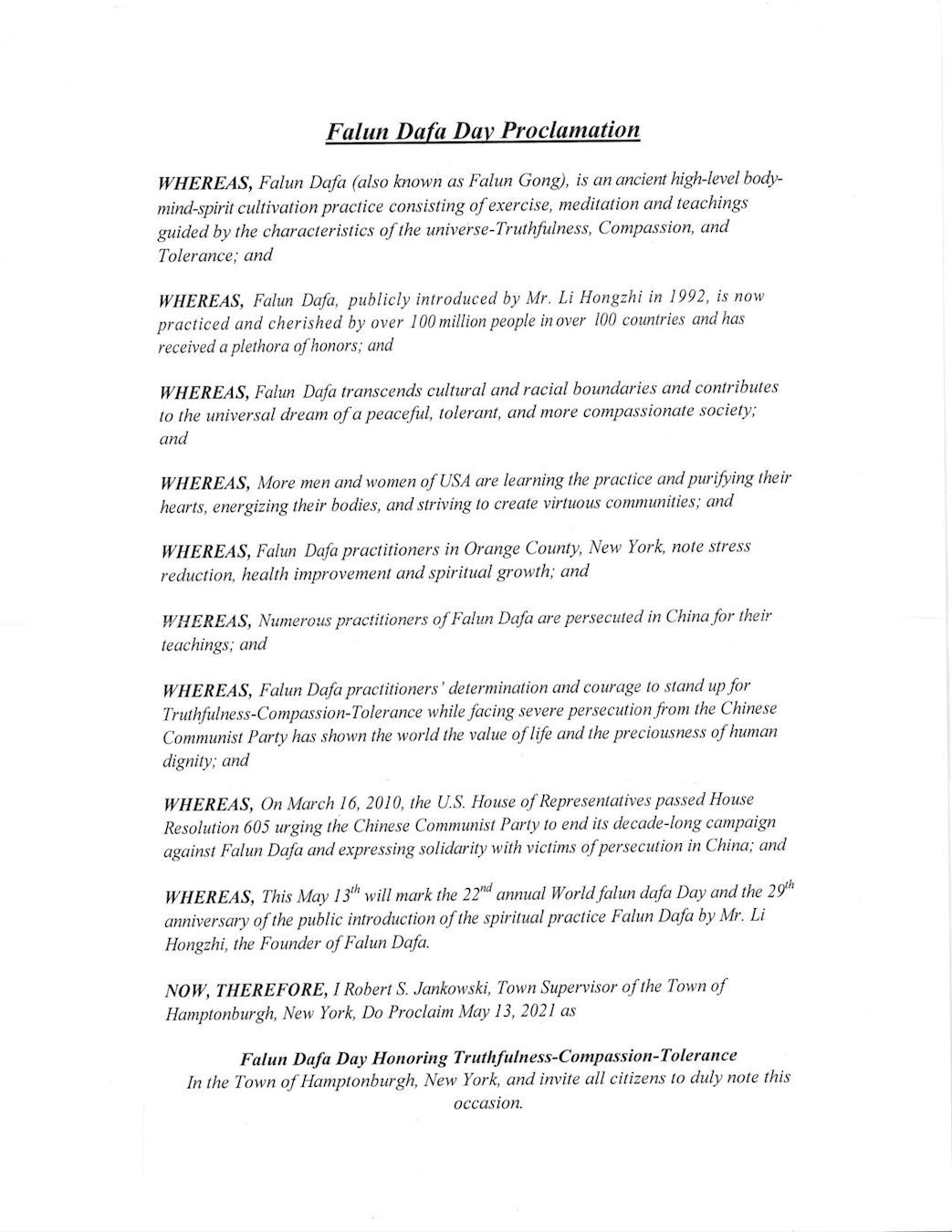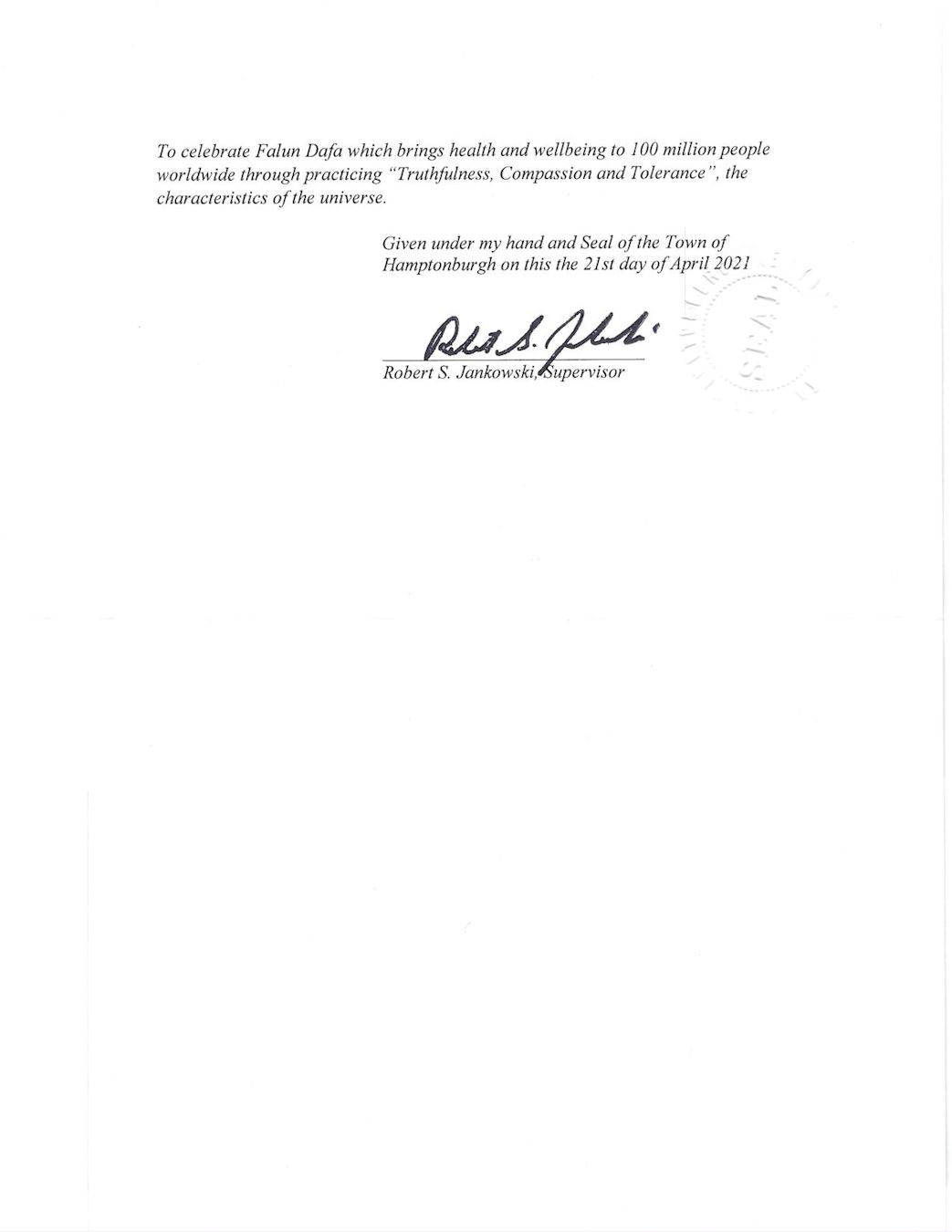 纽约州橙县汉普顿堡镇(Hamptonburgh)镇长罗伯特·扬科夫斯基(Robert S. Jankowski)宣告二零二一年五月十三日为纽约州普顿堡镇法轮大法日,并相邀所有市民届时关注此盛事,庆贺法轮大法给全世界上亿人民通过实践真、善、忍宇宙特性所带来的健康和福份。
