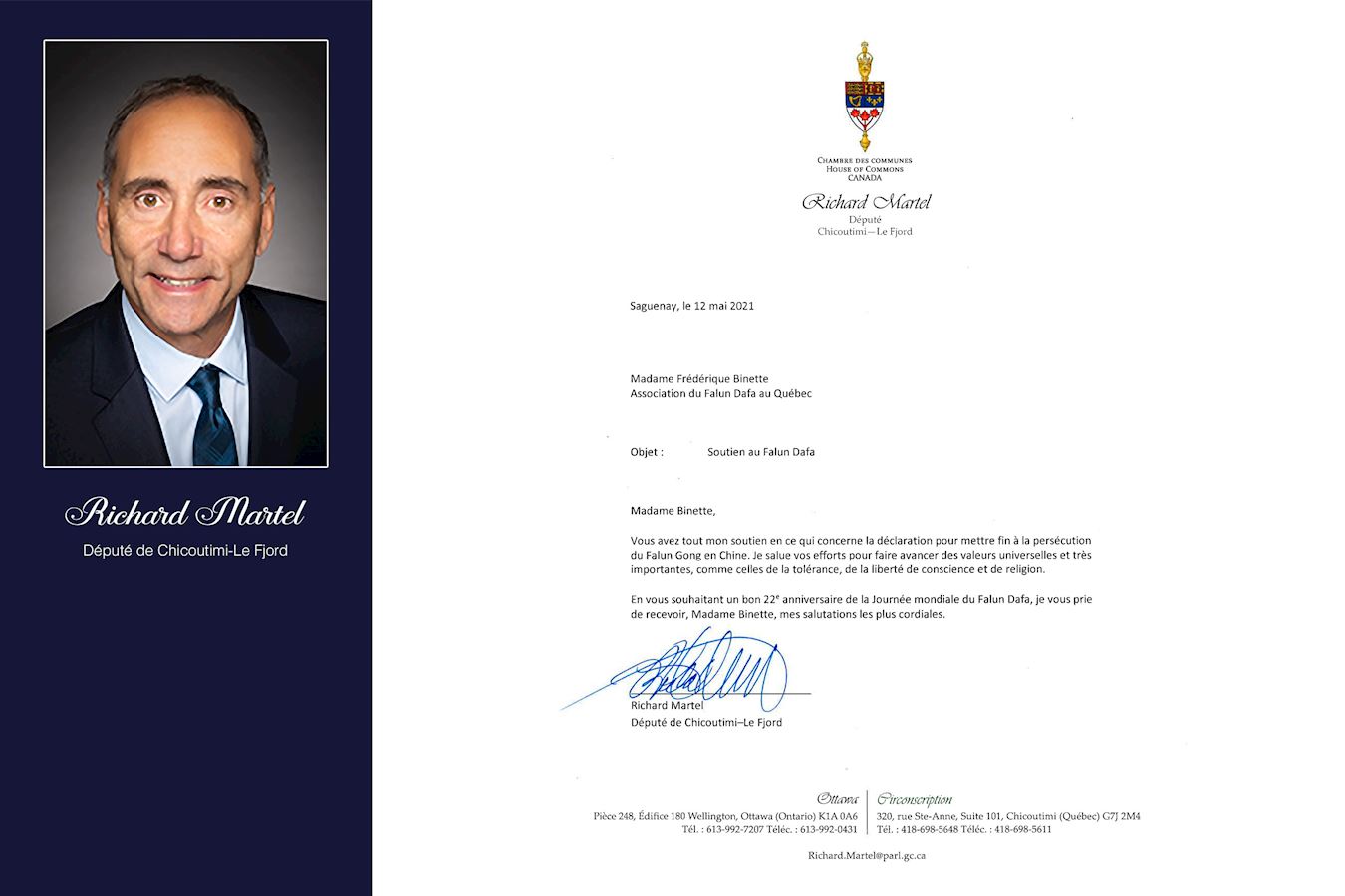 魁北克省联邦议员理查德·马特尔(Richard Martel)在信中恭贺法轮大法日,向法轮功学员表示致意,赞扬他们为弘扬真、善、忍普世价值付出的努力,支持法轮功学员对制止(中共)迫害的呼吁。