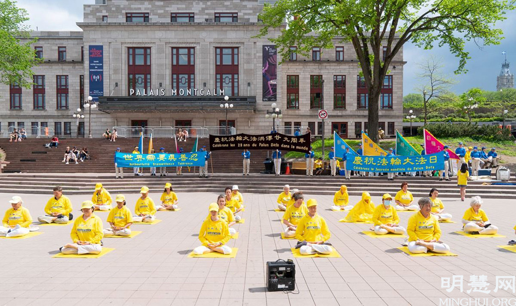 当日下午一点,法轮功学员们汇聚在该市中心的德尤维尔广场(Place d’Youville),庆祝活动由法轮大法天国乐团雄壮的鼓号声拉开帷幕。活动中,天国乐团演奏和法轮功学员们集体炼功交替进行,与此同时,法轮功真相车队在城区游行,将“法轮大法好”、“世界需要真善忍”的讯息传递给当地市民。