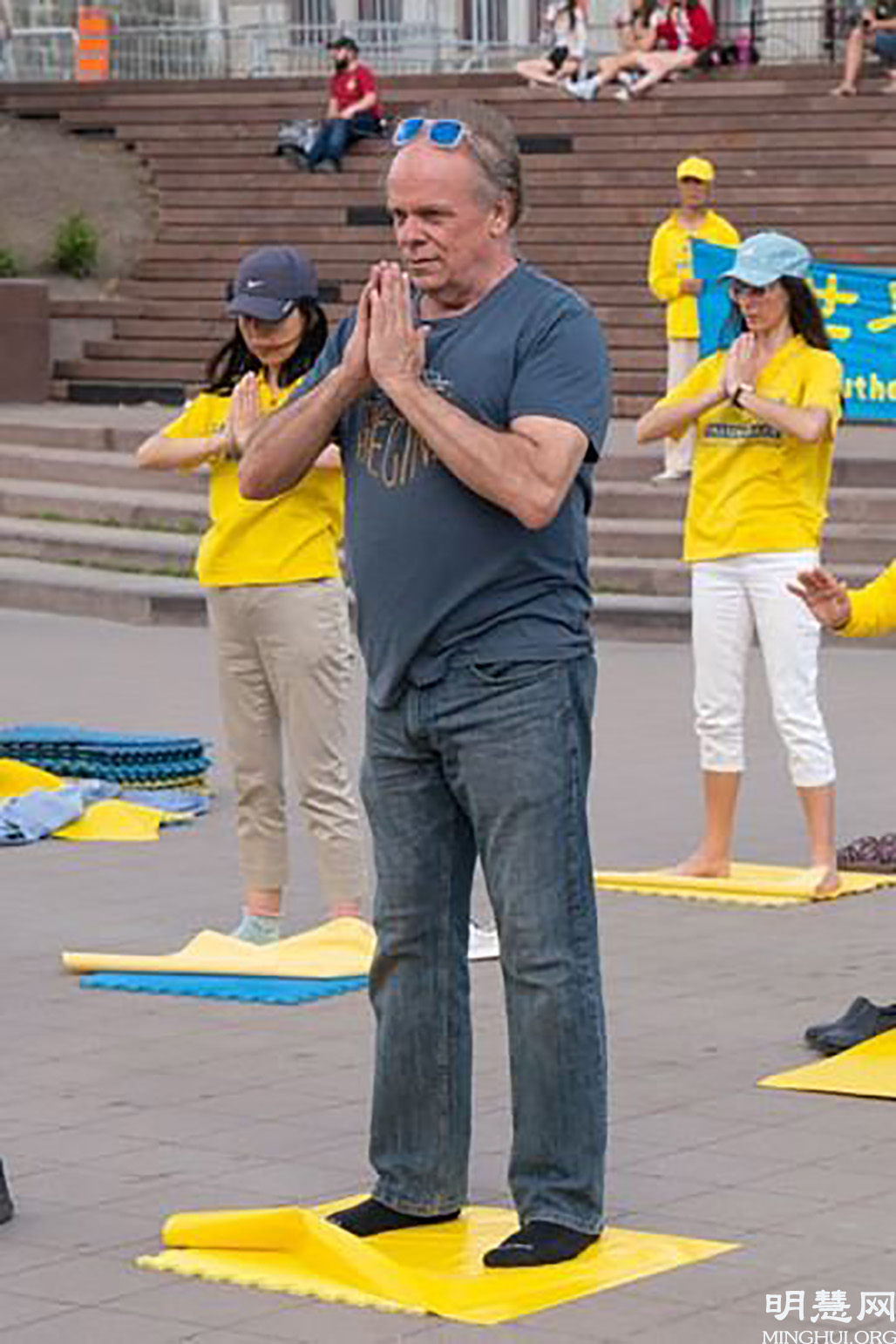 退休消防队员圣洛朗(Daniel St-Laurent)加入了炼功队列,跟着学炼了法轮功的第一至第四套功法。