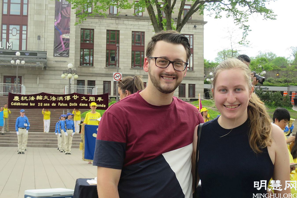 魁北克市居民乔纳森(Johnathan)和乔斯安(Joseane)开车经过时,被天国乐团的乐曲声吸引着了,特地泊了车来观看活动。在知道法轮大法的真相后,他们说,人人都应该来了解法轮大法。