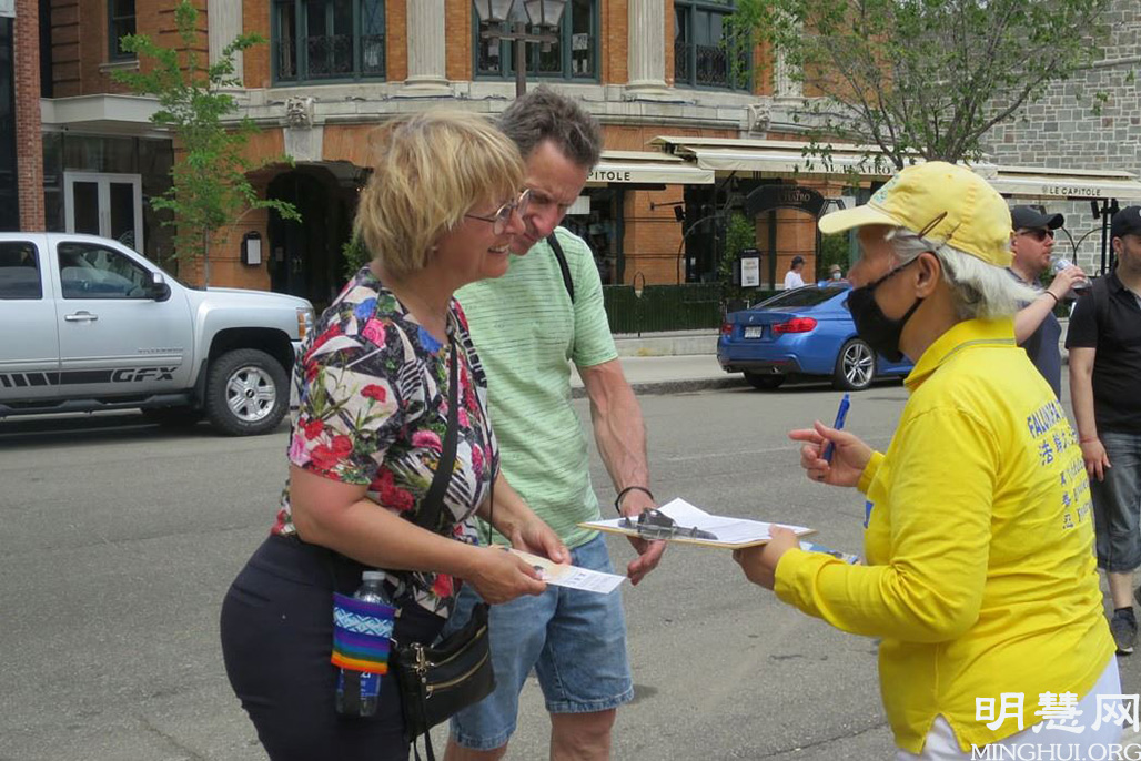 她说,魁北克的市民们都很愿意了解法轮大法,“当他们得知中共活摘法轮功学员器官的罪行时,都感到震惊。很多人在制止中共罪行的请愿信上签字,来表达对法轮大法的支持。”