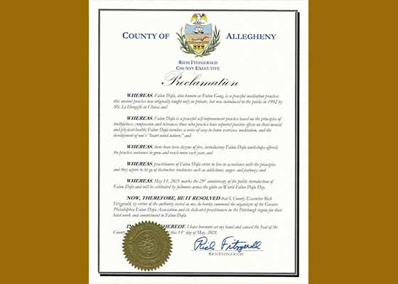美国宾州阿勒格尼郡郡长菲茨杰拉德颁发褒奖,赞扬法轮大法修炼者严格要求自己做好人,并在这过程中不断地去除贪婪、暴躁和妒嫉等缺点。