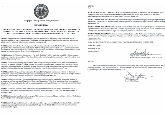 美国弗吉尼亚州库尔佩珀县委员会五月四日全票通过一项决议案,“最强烈地谴责中共迫害法轮功”,并强烈谴责中共活摘良心犯器官的行径。
