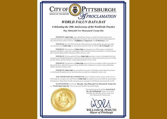 美国宾州匹兹堡市市长佩杜托颁发褒奖,表彰法轮大法为超越文化和国家界限而做出的贡献。
