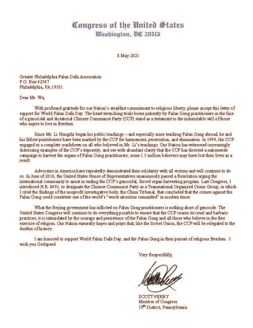 佩里众议员(Scott Perry)在褒奖信中说:“为了我们国家对宗教自由的坚定承诺,怀着深深的敬意,请接受这封支持世界法轮大法日的信。”