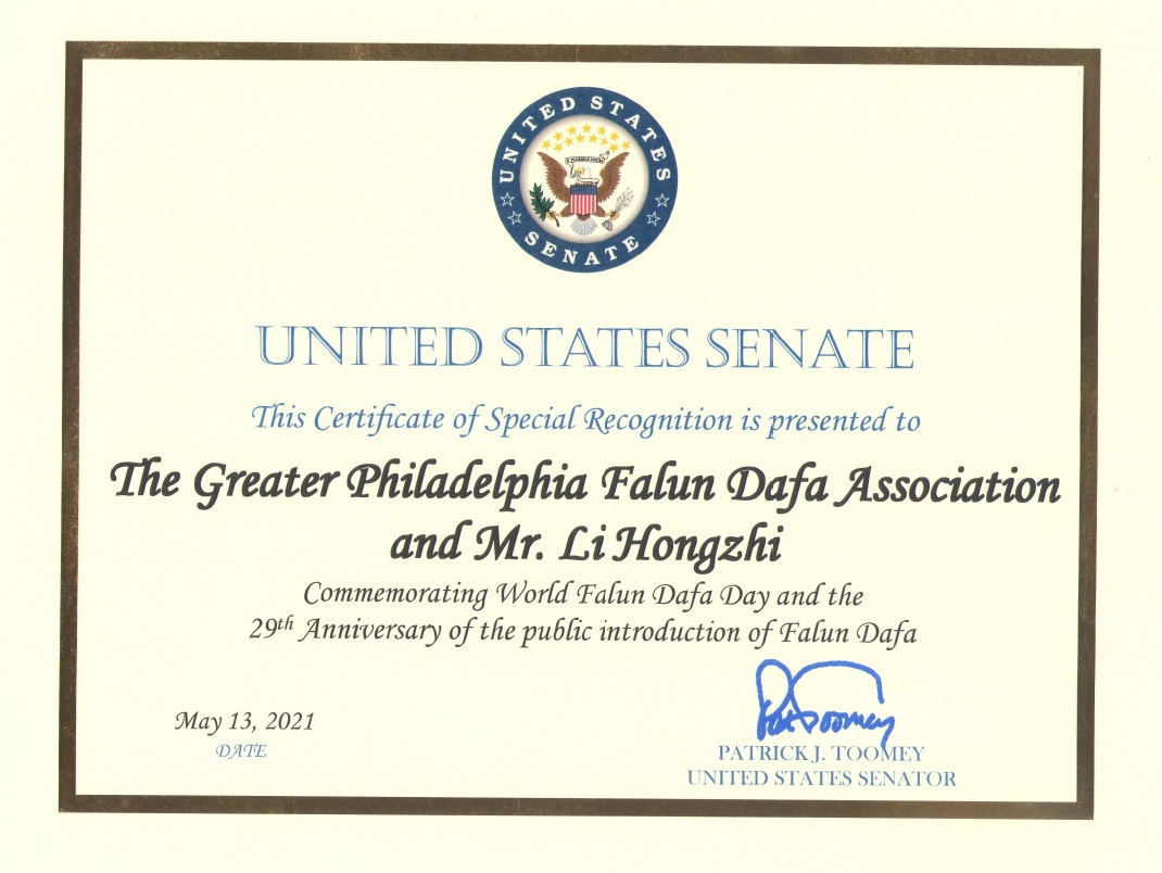 宾州联邦参议员帕特里克·图密(Patrick J. Toomey)颁发褒奖给大费城法轮大法学会和李洪志先生,庆祝世界法轮大法日和法轮大法洪传世界第二十九周年。