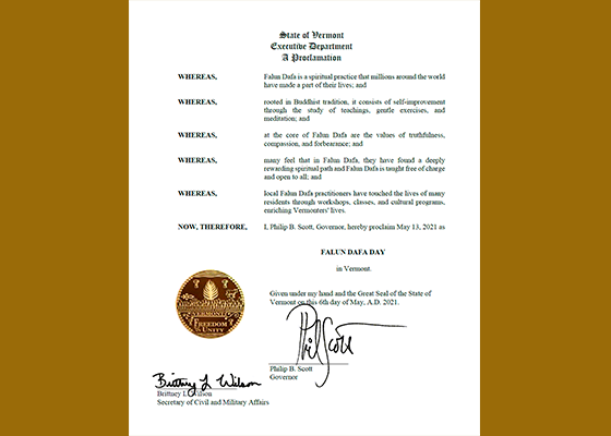 在年世界法轮大法日即将到来之际,佛蒙特州州长颁发褒奖状, 宣布二零二一年五月十三日为“佛蒙特州法轮大法日”。