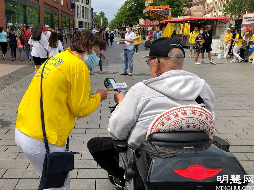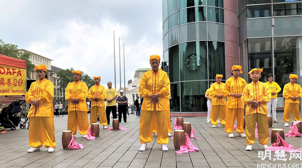 杜伊斯堡位于德国北威州,因为当地及周边很多地区感染中共病毒的人数明显减少,商店和餐馆不久前基本恢复正常营业了。周六的活动在市中心的步行街,来往的众多路人都很高兴可以正常购物了。法轮功学员的腰鼓表演增添了喜庆的气氛,赢得了阵阵掌声。
