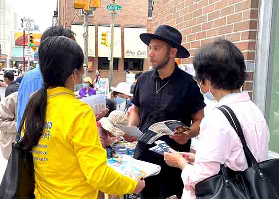 六月十二日,法轮功学员在费城中国城举办活动,向游人讲述法轮大法的美好,揭露中共迫害法轮功、活摘法轮功学员器官的罪行。
