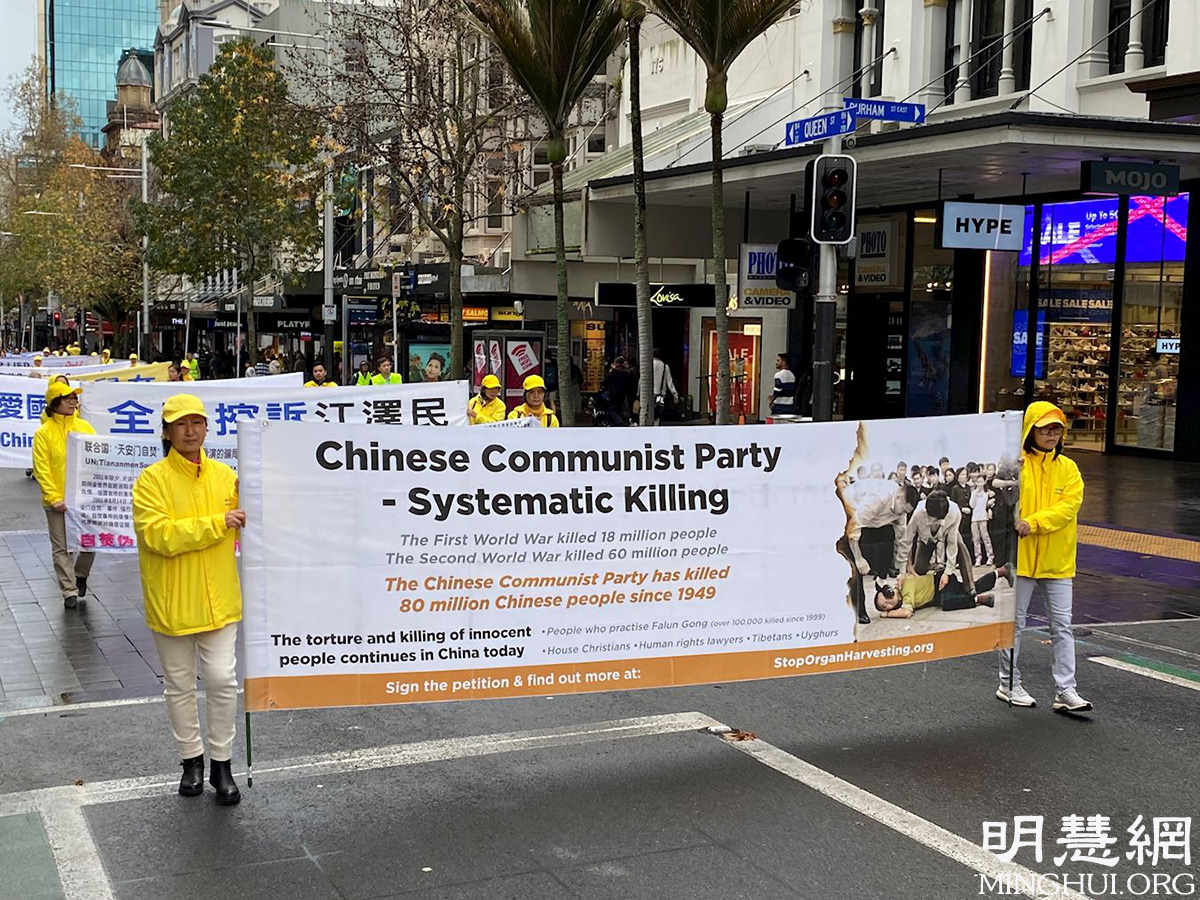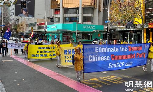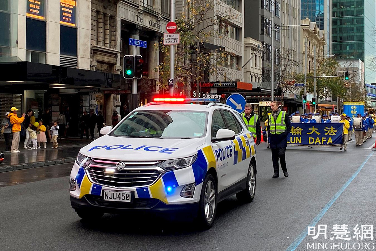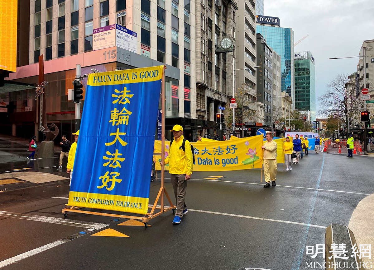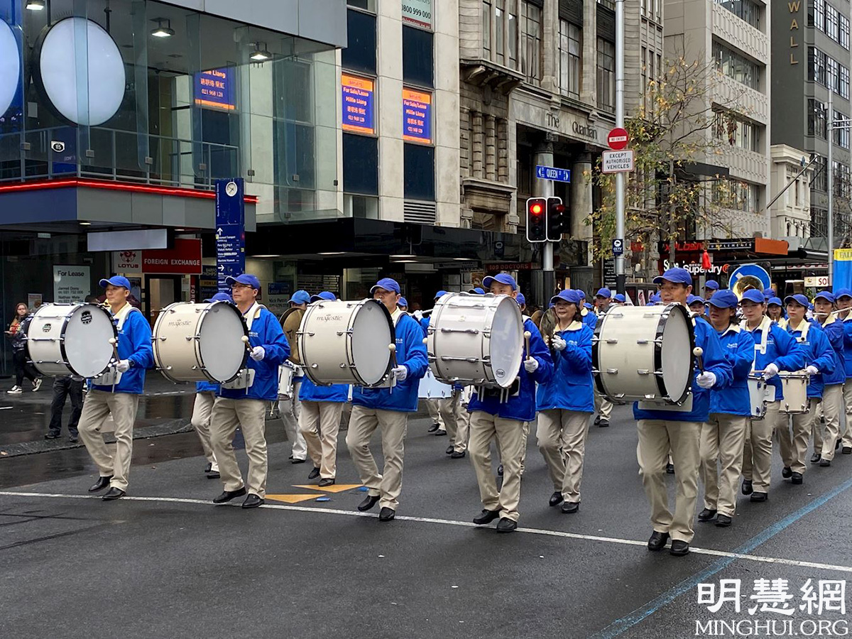 游行从市中心的伊丽莎白广场开始,一直到奥提雅(Aotea)广场,这是奥克兰最繁华的商业街,街道两边高楼耸立,行人不绝。游行现场警车开道,首先映入人们眼帘的是法轮功学员组成的天国乐团,蓝白相间的服饰、雄壮的乐曲,立即吸引了人们的注目。