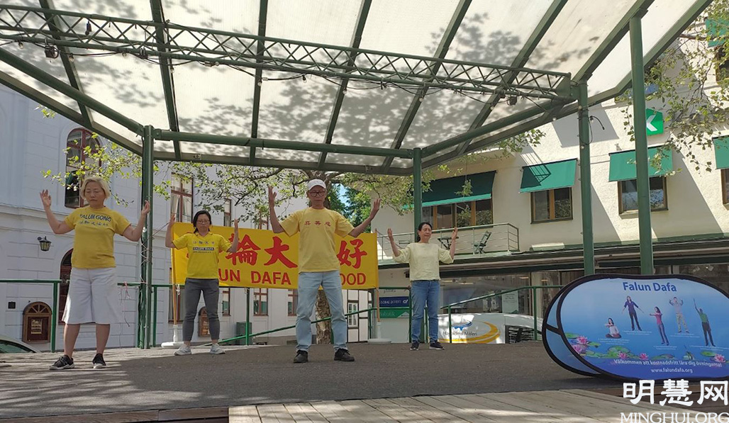 ![]() 图1:法轮功学员在卡尔玛市(Kalmar)拉姆广场(Larmtorget)的舞台上集体炼功 |