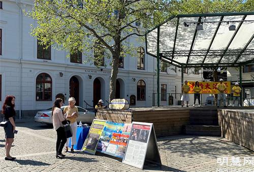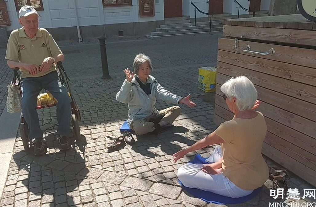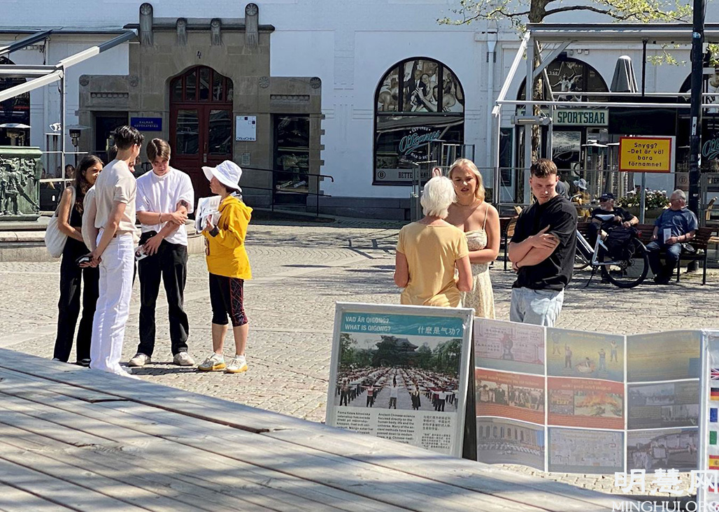 二零二一年六月四日下午,卡尔玛市(Kalmar)拉姆广场(Larmtorget)的舞台响起了法轮功音乐,法轮功学员伴随着祥和的音乐向卡尔玛市民众展示功法。在喧哗的广场上,越来越多的人们的目光转向了广场的舞台。路经此地的人们停下了脚步,有的人向法轮功学员了解真相,有的人阅读展板上的内容,还有的人学着台上法轮功学员做着炼功动作。