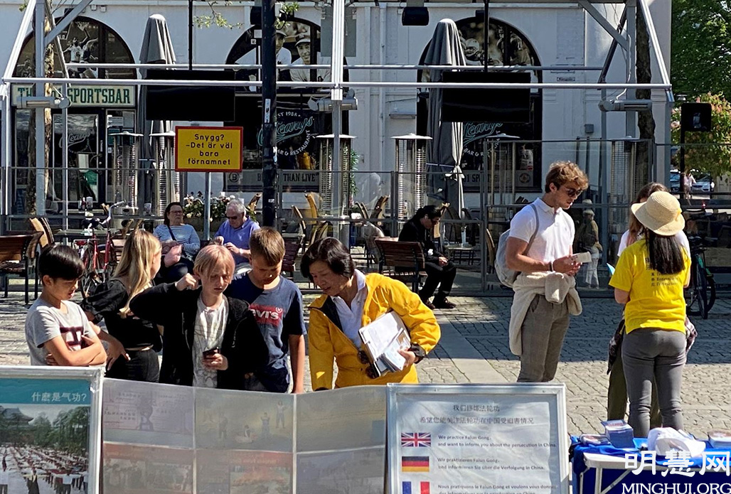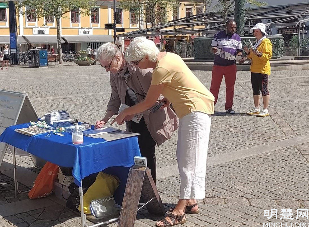 一位白发苍苍的瑞典老太太走过来,接过传单后对法轮功学员说:“大约十七年前我在这里看到过你们,了解了一些你们遭受迫害的真相。这场迫害还没结束?至今还在继续?”学员告诉老太太迫害仍在继续,且愈演愈烈,并用自己的亲身经历讲述了中共迫害法轮功的真相,希望瑞典民众能帮助结束迫害并解体中共。老太太说:“怎能容忍一个独裁的政府残害自己的民众?我支持你们,我来签名。”