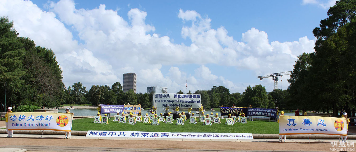 二零二一年七月十日,休士顿法轮功学员在荷门公园(Hermann Park)举办反迫害活动。下午四点集会开始,学员在湖畔搭配演讲台,并展开“解体中共 停止迫害法轮功”、“法轮大法好”等真相横幅。期间部分学员们手持花圈,上面有因修炼被迫害致死学员的遗像,让来往市民了解中共邪恶本质,征签支持法轮功。
