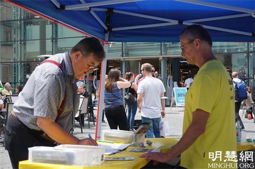 一位骑自行车路过的德国中年人,在看到横幅内容后停下来,直接来到展点,在两个征签表上都签了名。他说,“我关注中国发生的事情大约有二十年了,我知道法轮功被迫害,我知道中共镇压学生民主运动,它在西藏、新疆、香港到处犯下的罪恶。所以,我从来不买中国产品,不管它多便宜,因为我不想支持这个独裁政府。可惜的是,很多西方政治家、西方企业包括德国企业在内,为了利益对中共卑躬屈膝,养大了这头狼。是世界该警醒的时候了!”