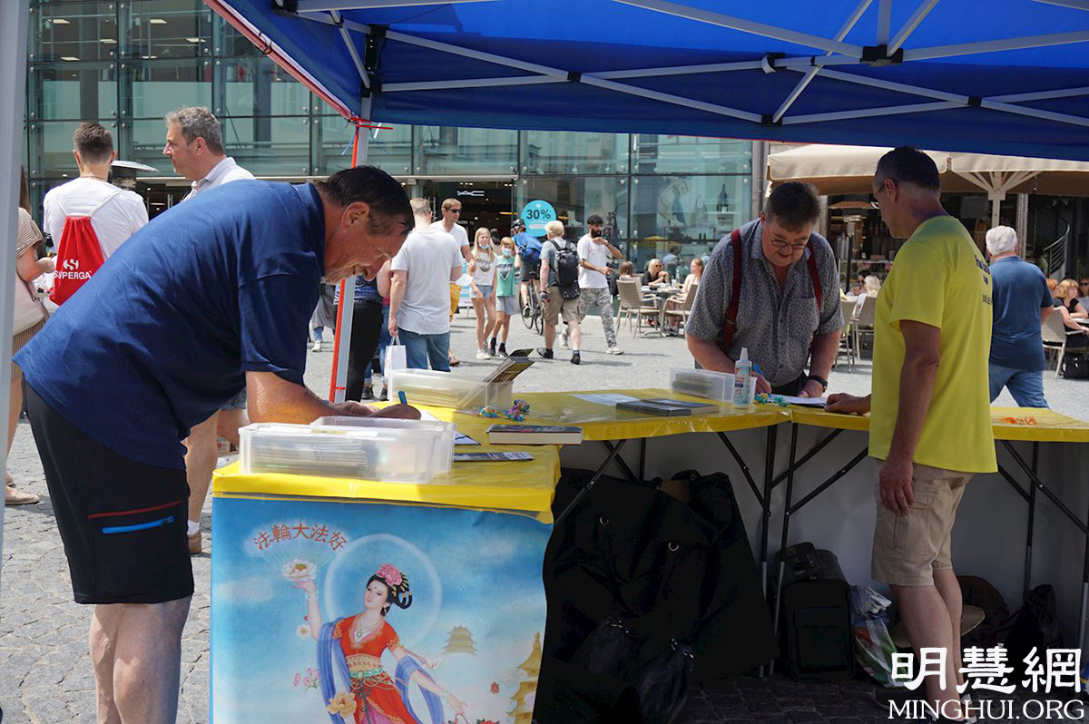 一位中年德国男士在看到展点后,直接就走上前来希望能签字支持,他表示自己对中共的罪行关注已久,也痛恨已久,他说,“中共坏透了,它能做出活摘法轮功学员器官的罪恶,我完全相信。但是世上还有很多人不知道。希望人们都能知道发生在中国的事情,认清中共。”