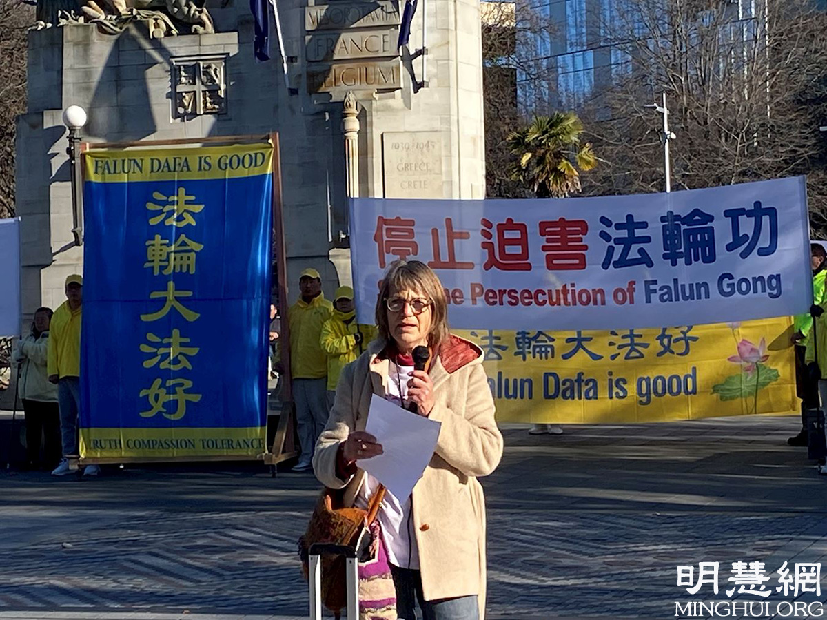 新保守党成员海伦·霍顿(Helen Houghton)因为身体抱恙无法来现场,她的同事戴安(Dianne)替她朗读了演讲稿,她说:“我今天在这里是为了捍卫人权,为了所有人的自由,你的自由,《新西兰权利法案》中所述的自由。新西兰政府必须认真对待中国及其他国家的人权问题,以牺牲人民的生命为代价来维持贸易关系是不可取的。”
