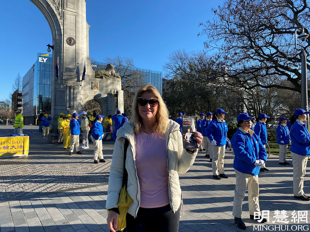 安杰莉卡·沃森(Angelique Watson)是一位基督城居民,在脸书上得知活动消息,就特地赶来参加。她说:“我反对共产主义,反对所有独裁政权。中共活摘人体器官是邪恶的、反人类的。他们让人不再是人,很多人因为恐惧而不敢站出来反对。”