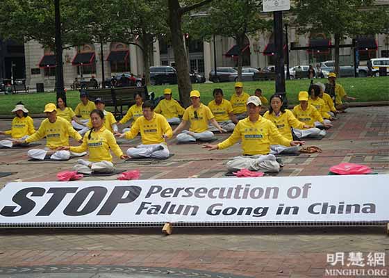 七月十一日,波士顿法轮功学员在科普利广场举办集体炼功、设置真相海报展、讲述反迫害历史等反迫害活动。