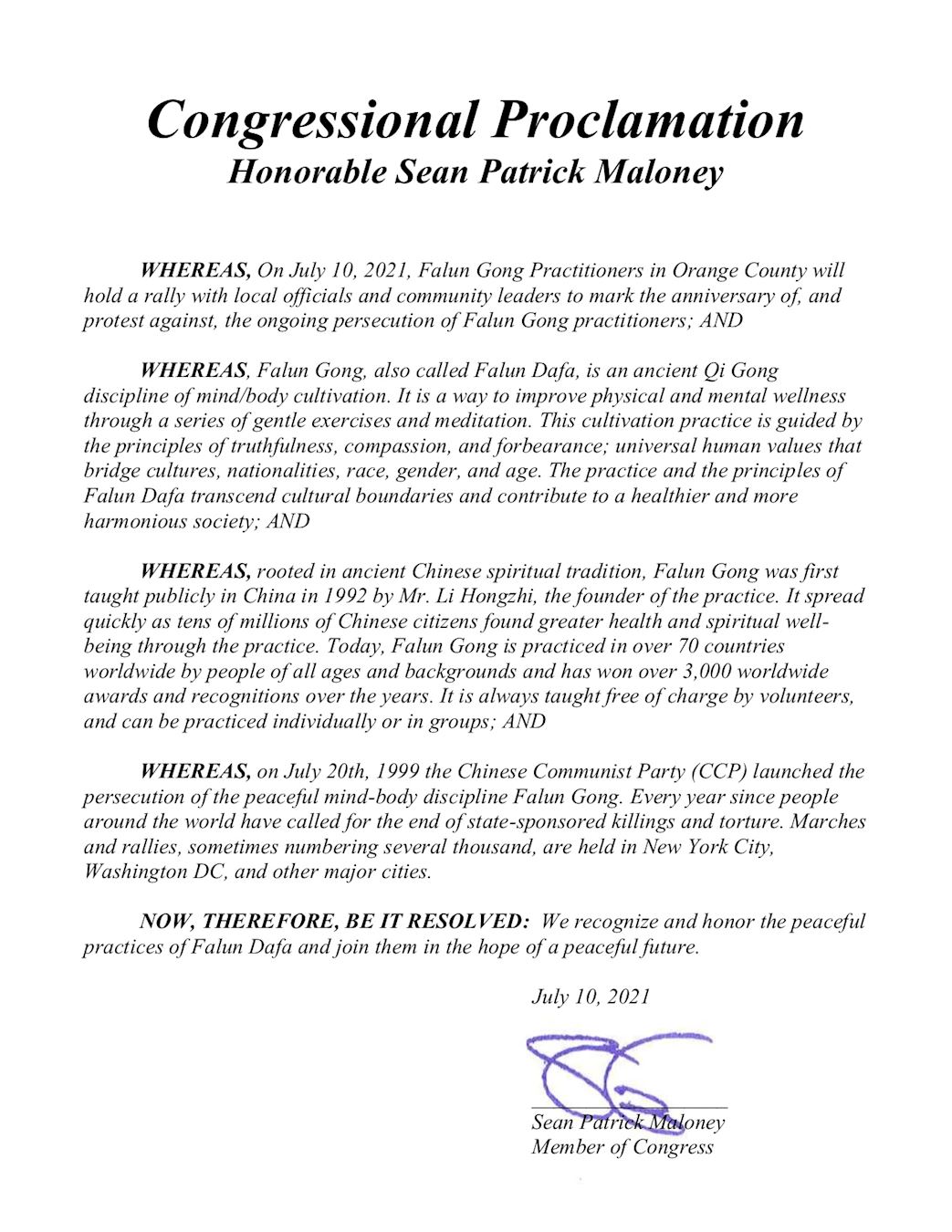 纽约州联邦第十八选区国会议员肖恩·马洛尼(Sean P. Maloney)发来国会褒奖令,赞誉法轮功,表示承认并尊重平和修炼的法轮功,并与他们一起祈愿和平的未来。