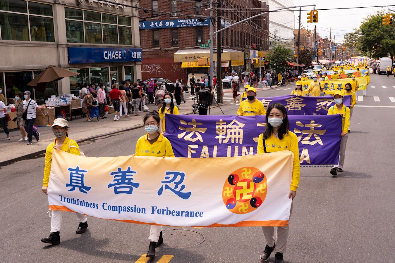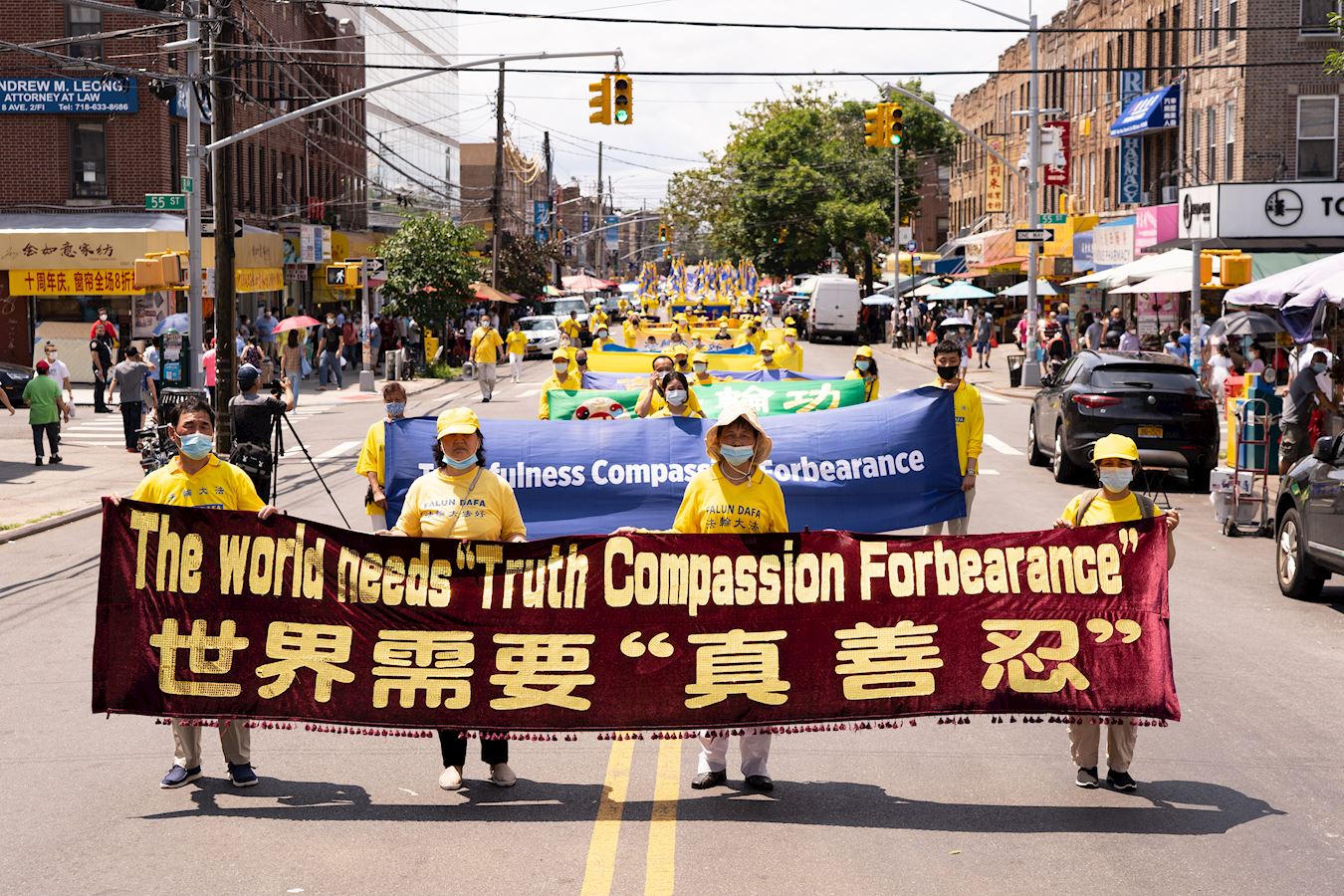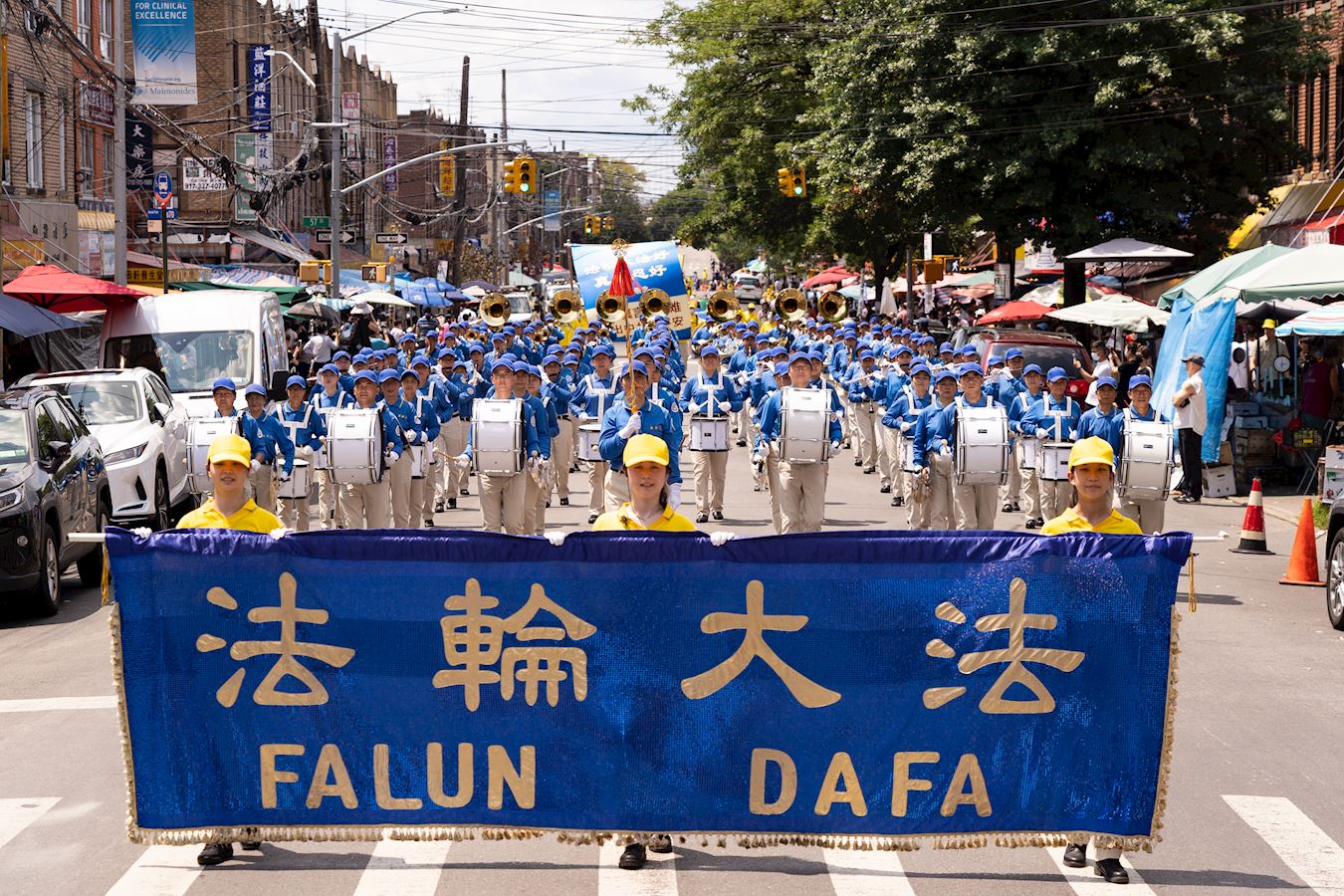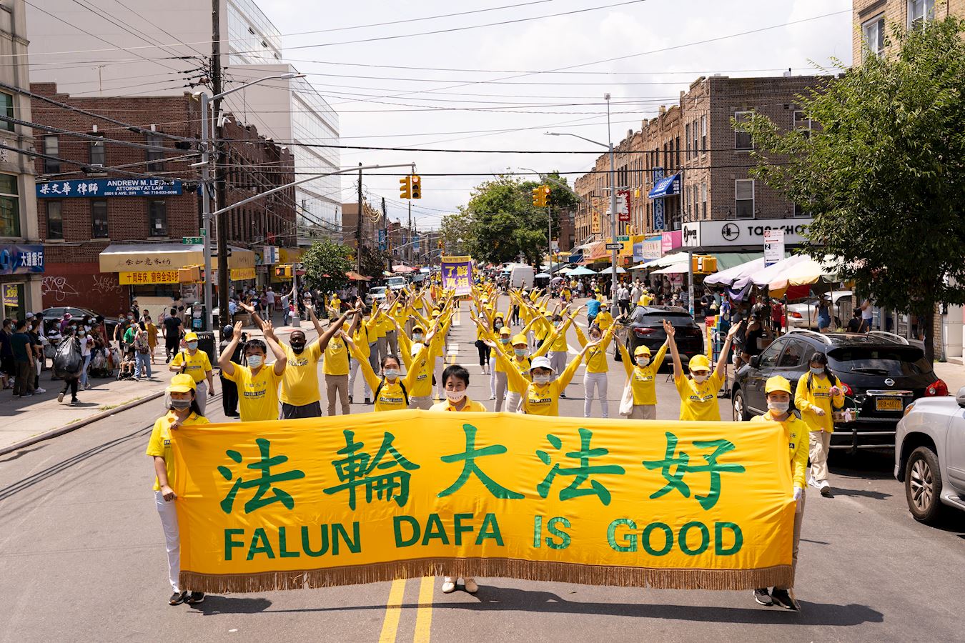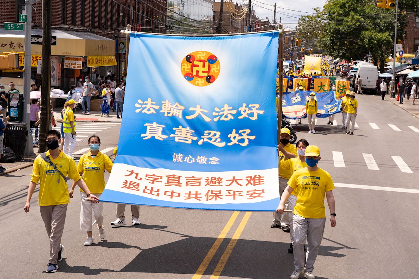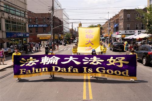 第一方阵“法轮大法好”。打头阵的天国乐团为布鲁克林的民众演奏了“法轮大法好”、“送宝”、“凯旋”等曲目,嘹亮乐音贯穿八大道的大街小巷。讲述大法美好的巨型竖幅、各式横幅在阳光下非常的醒目亮眼。 “九字真言避大难、退出中共保平安”的巨型竖幅和“瘟疫面前保命良方,诚念法轮大法好,真善忍好”的大型横幅,传递着天机,希望世人能够平安渡过劫难。