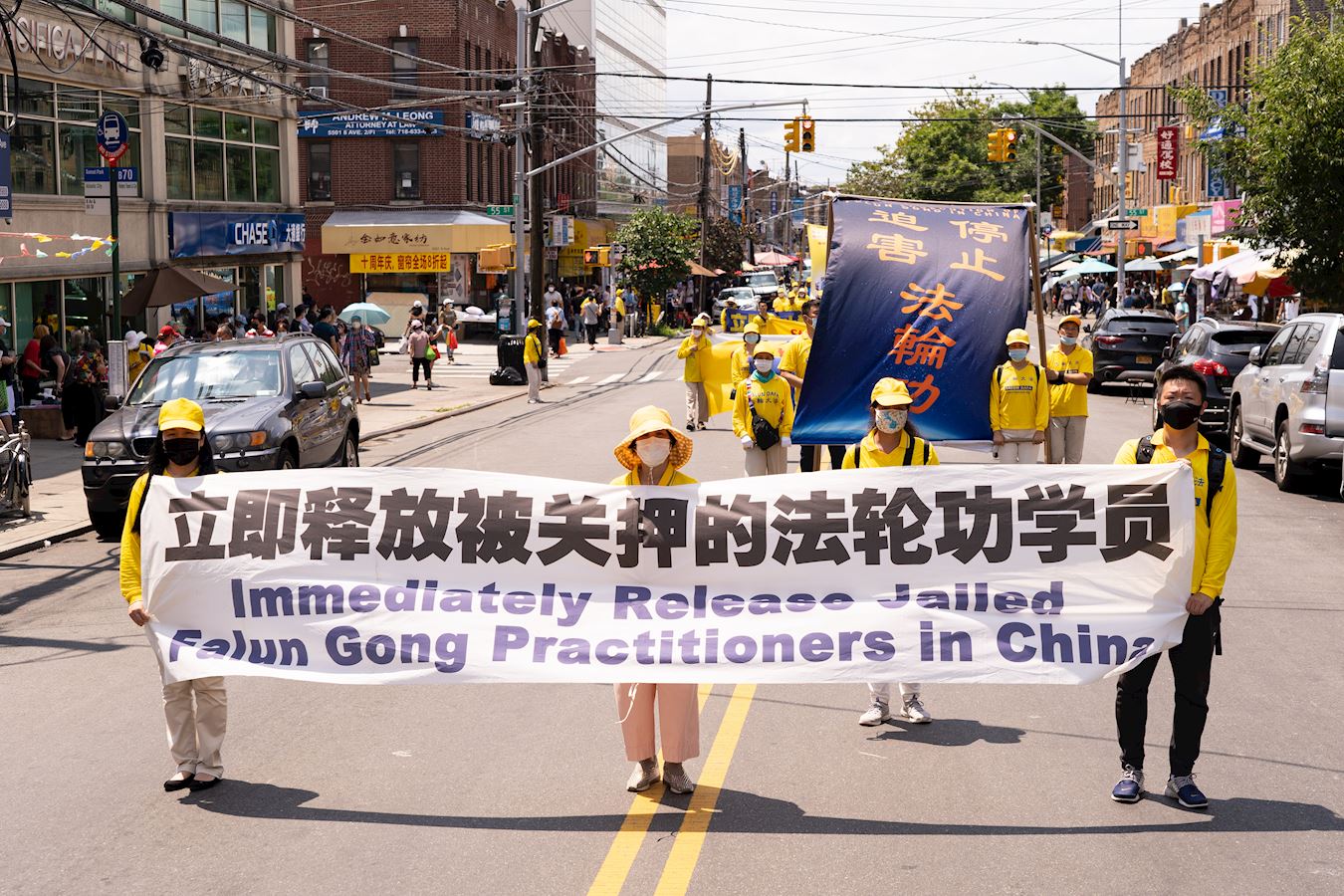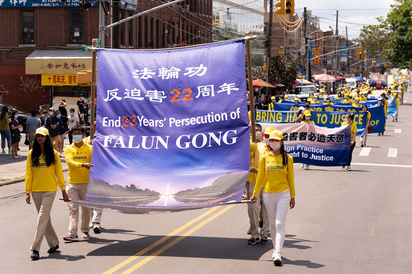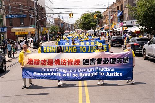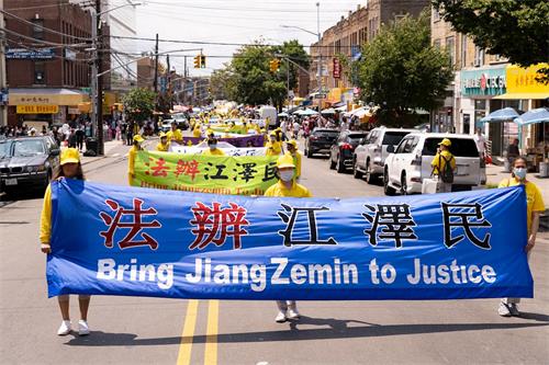 当天的游行,有法轮功支持者跟随队伍走完全程。