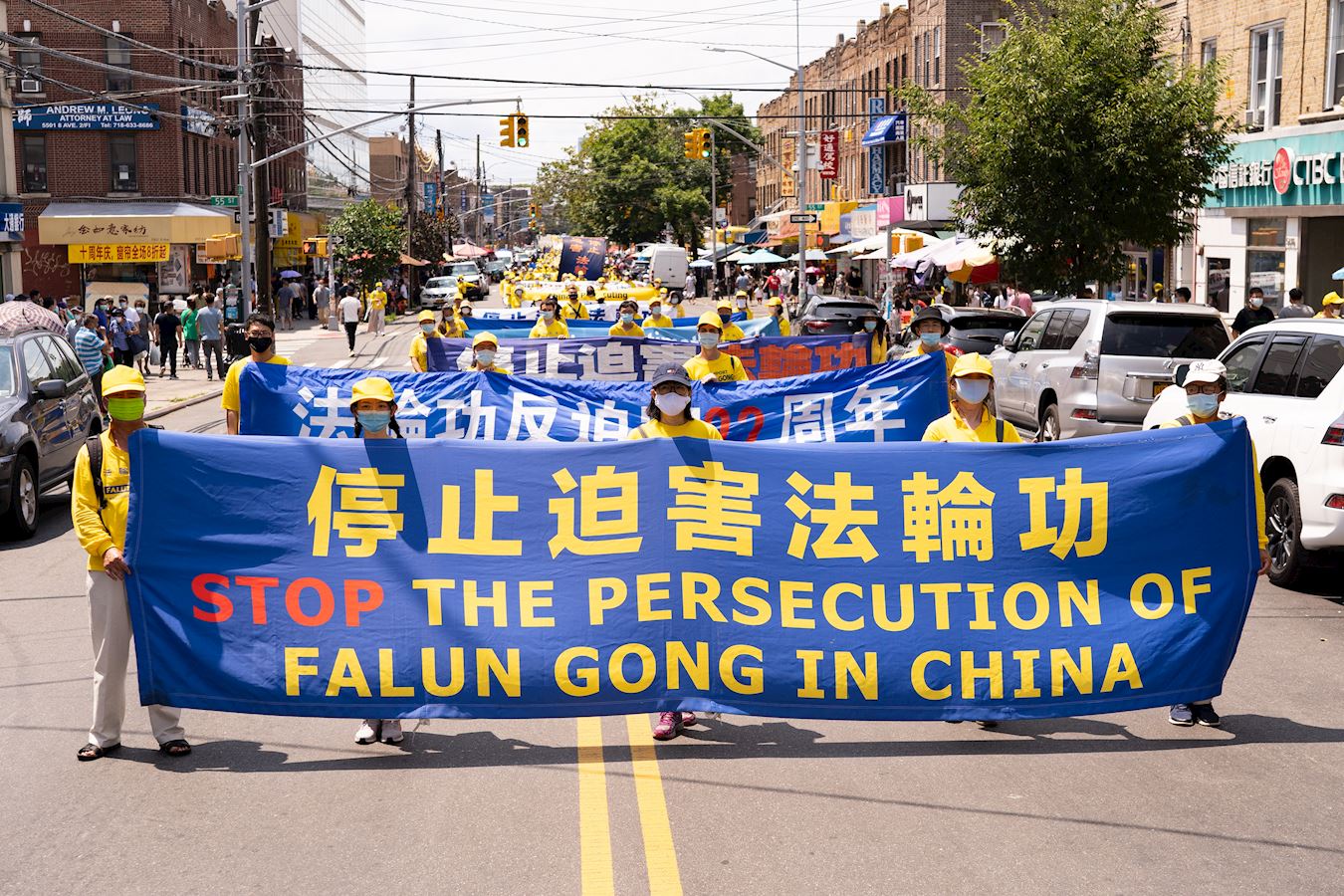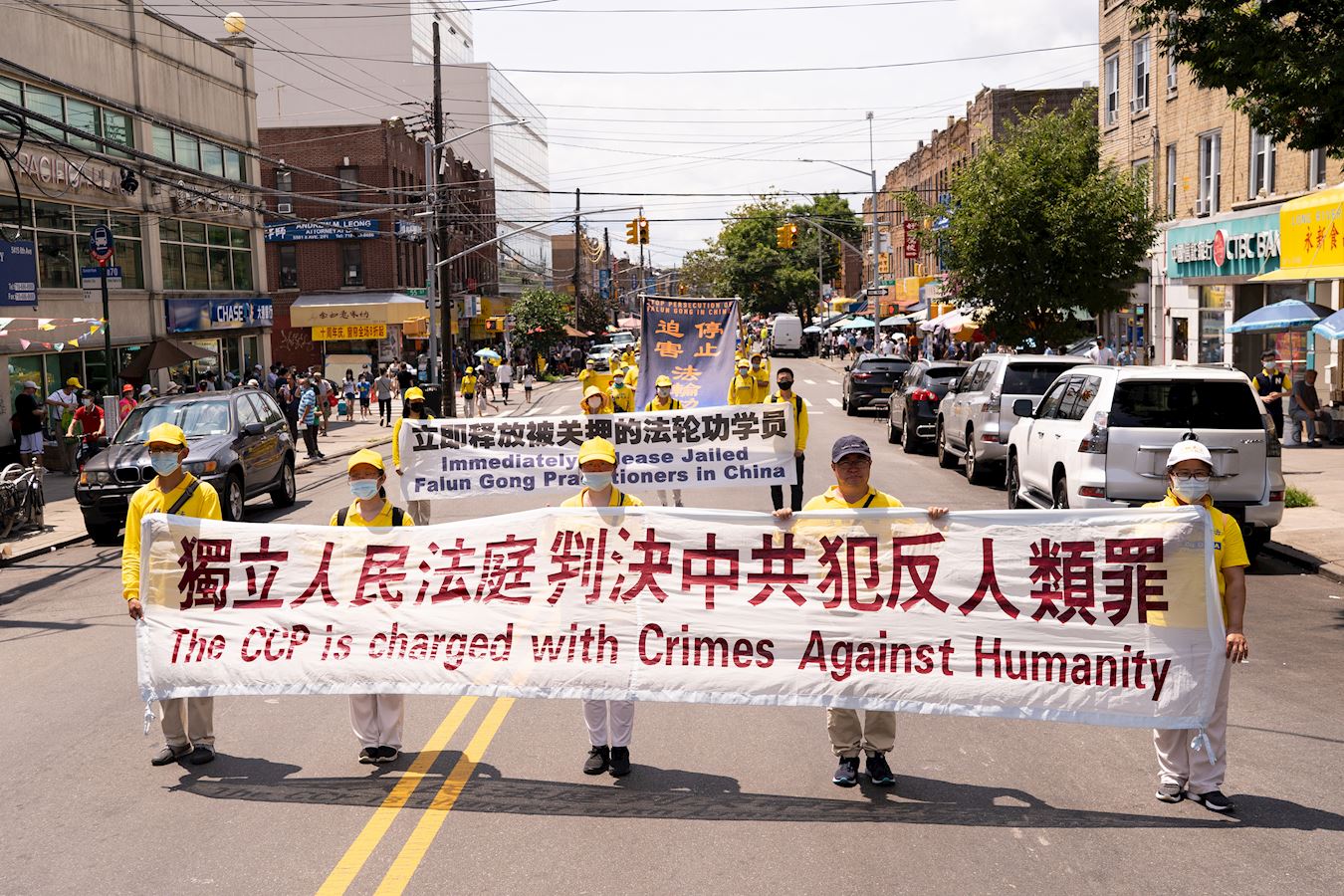 游行分为三大方阵:“法轮大法好”、“停止迫害法轮功”、“祝贺3.8亿勇士退出中共”。