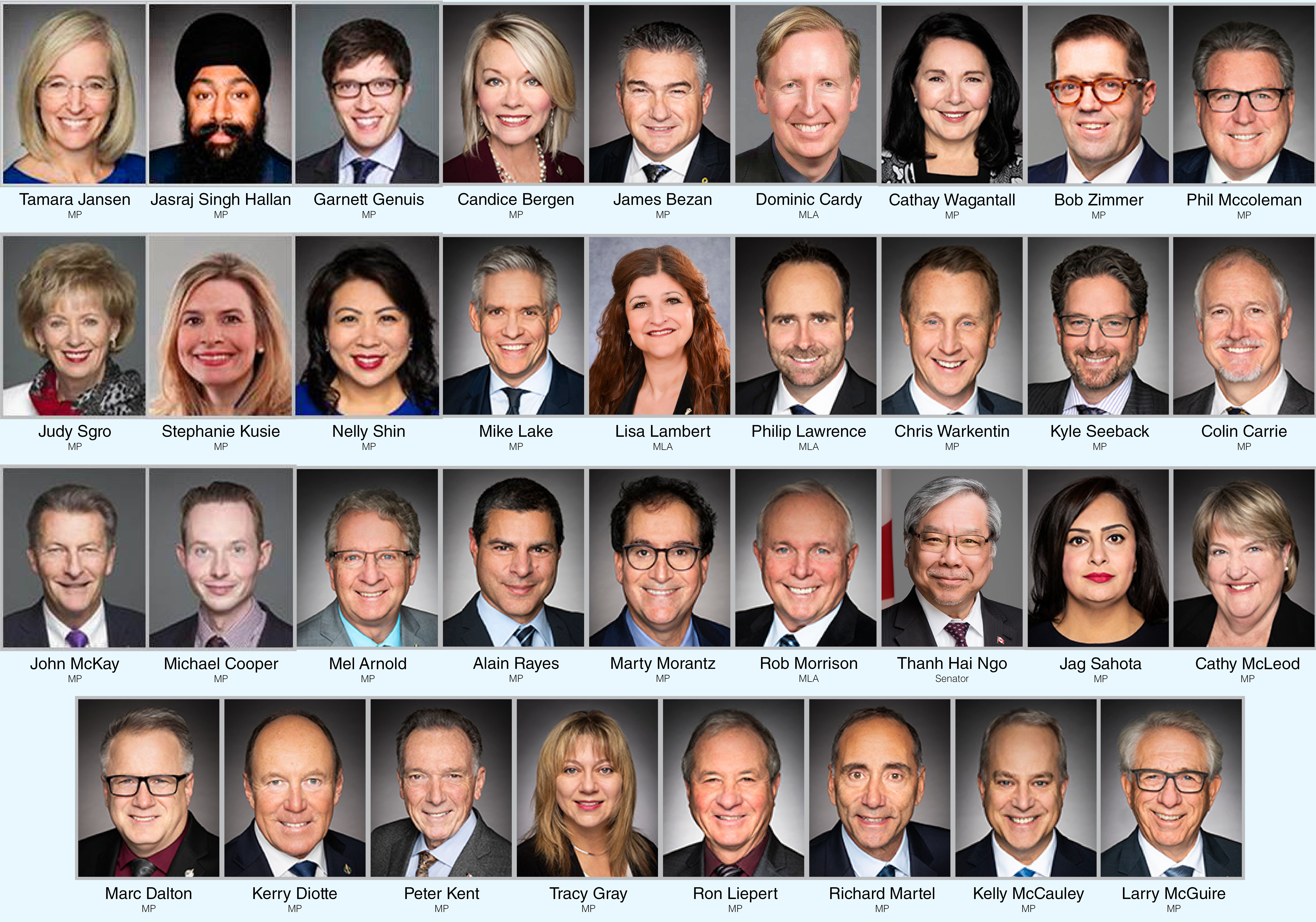 Mel Arnold(MP),Candice Bergen(MP),James Bezan(MP),Dominic Cardy(MLA),Colin Carrie(MP) ,Michael Cooper(MP),Marc Dalton(MP),Kerry Diotte(MP),Tracy Gray(MP),Garnett Genuis(MP),Jasraj Singh Hallan(MP),Tamara Jansen(MP),Peter Kent(MP),Stephanie Kusie(MP),Mike Lake(MP),Lisa Lambert(MLA),Philip Lawrence(MP),Ron Liepert(MP),Richard Martel(MP),Kelly McCauley(MP),Phil McColeman(MP),John McKay(MP),Cathy McLeod(MP),Alain Rayes(MP),Marty Morantz(MP),Rob Morrison(MP),Jag Sahota(MP),Kyle Seeback(MP),Judy Sgro(MP),Nelly Shin(MP),Cathay Wagantall(MP),Chris Warkentin(MP),Bob Zimmer(MP),Thanh Hai Ngo(senator), Larry Maguire(MP)。