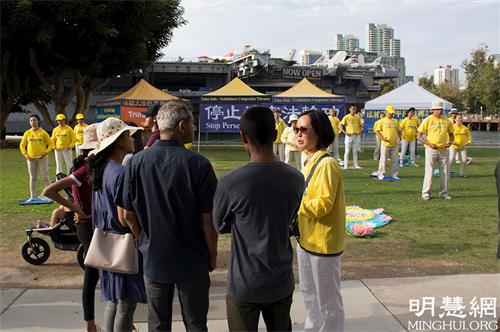 ![]() 图5-6:民众驻足听法轮功学员讲真相 |