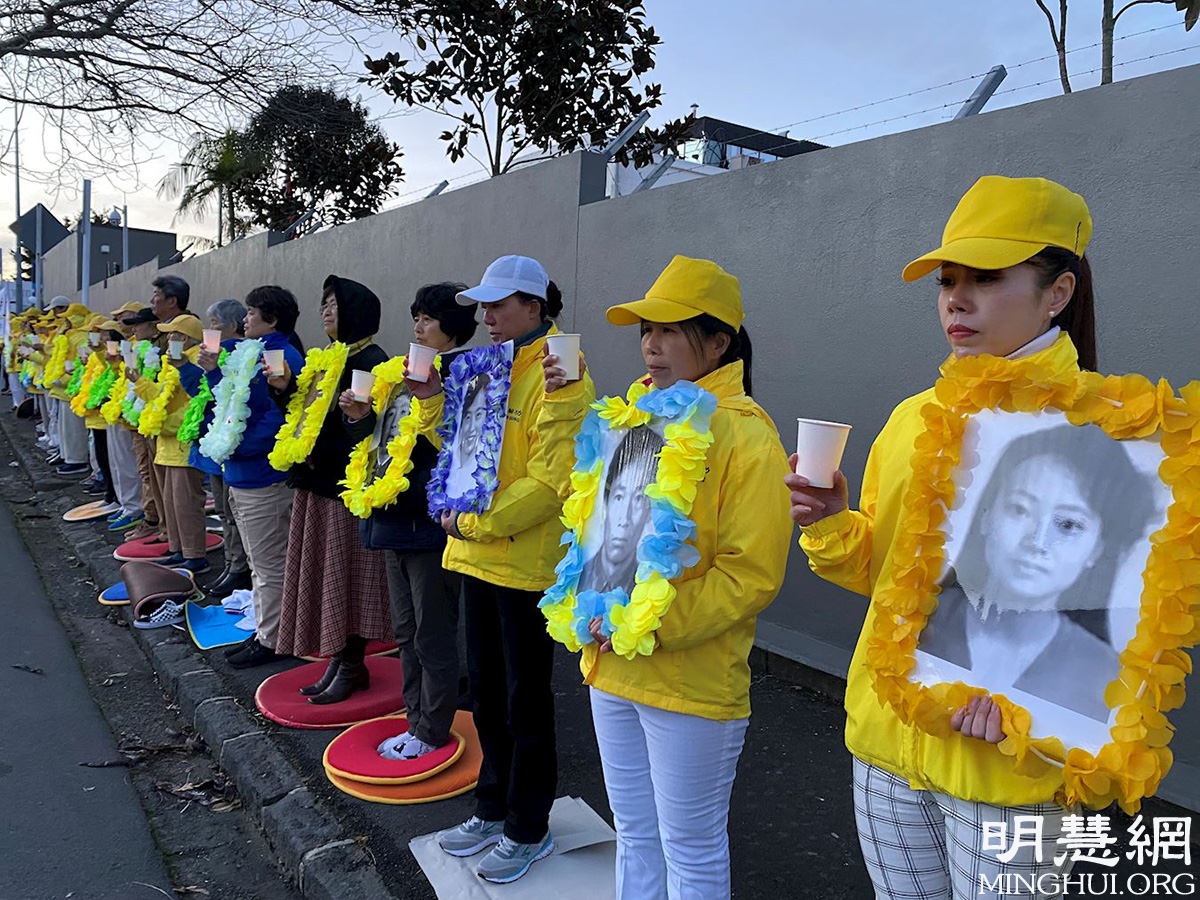'图1~4:法轮功学员在奥克兰中领馆前举行烛光悼念活动'
