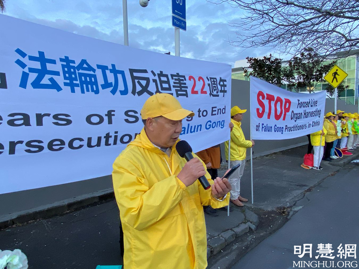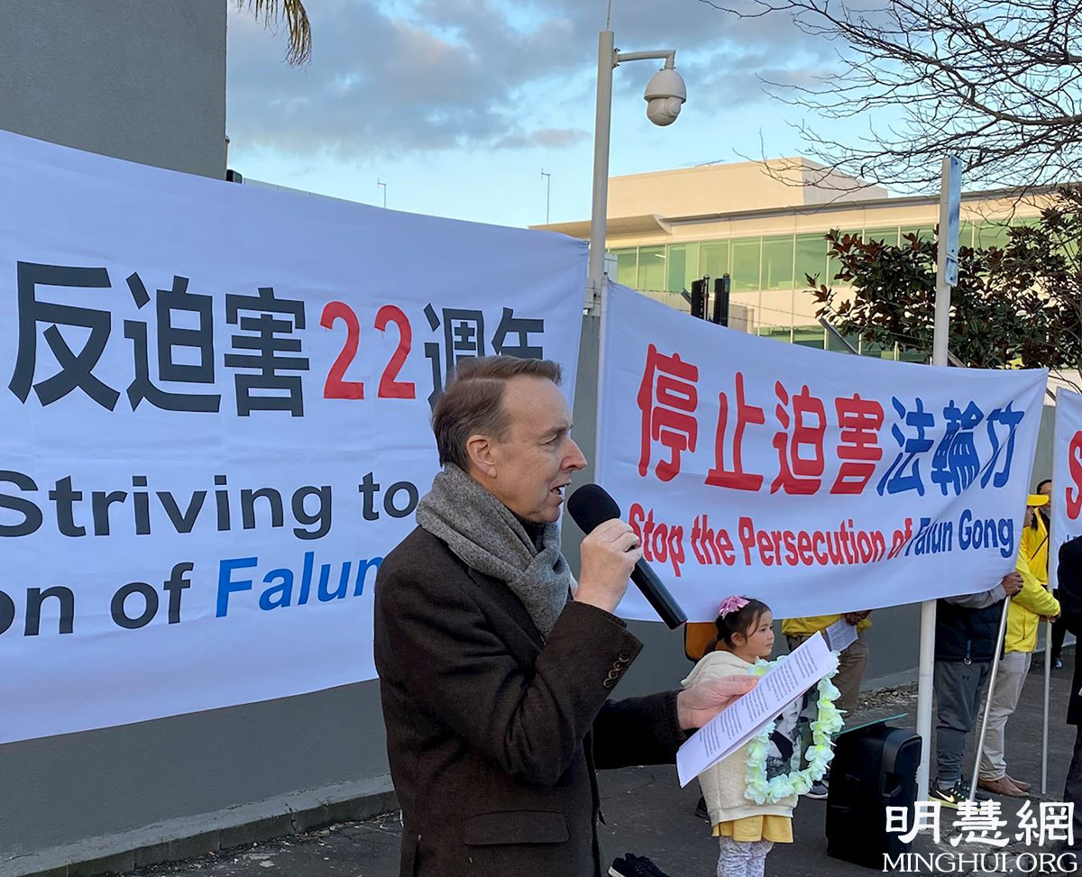 新西兰著名人权律师凯瑞·高尔(Kerry Gore)在集会发言中说:“到二零二一年七月二十日,中共在中国迫害法轮功学员已整二十二年。在这场运动中,法轮大法学员受到了许多不同形式的残酷迫害,甚至被活摘器官导致死亡。这是一场国家范围的谋杀。