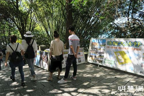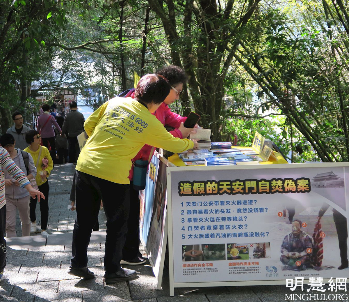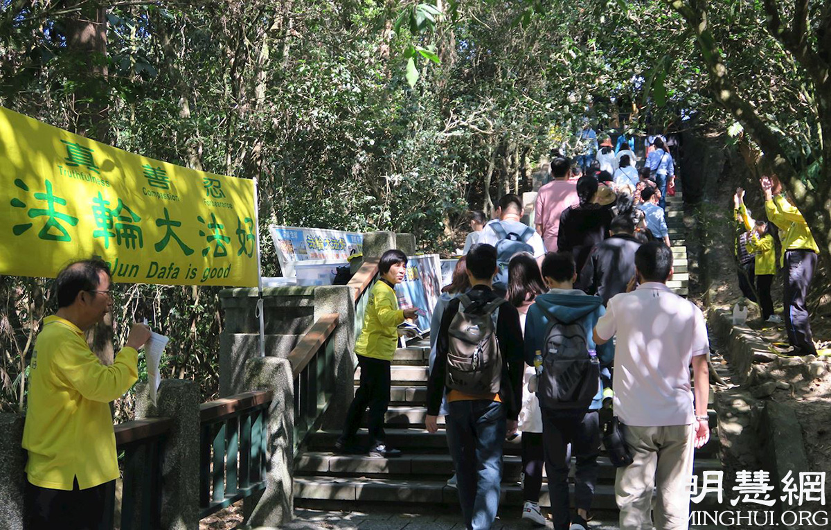 图3-4:青龙步道上,大陆游客停下脚步,关注法轮功真相。