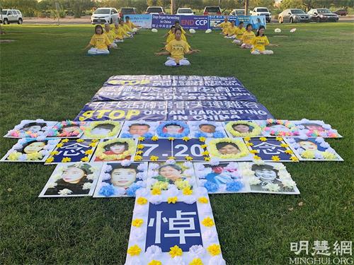法轮功学员们搭起呼吁“解体中共”、“制止中共活摘器官”等标语的展板,在学员队列的正前方摆放上被迫害致死的学员遗像和三幅写有“呼吁停止迫害法轮功”、“中共活摘器官天理难容”和“法轮功反迫害22周年”的横幅,开始了集体炼功、诗朗诵、学员代表发言和烛光悼念的活动。来往的路人被祥和的炼功场面所吸引,在听明白了法轮功被迫害的真相后,纷纷签名支持反迫害。