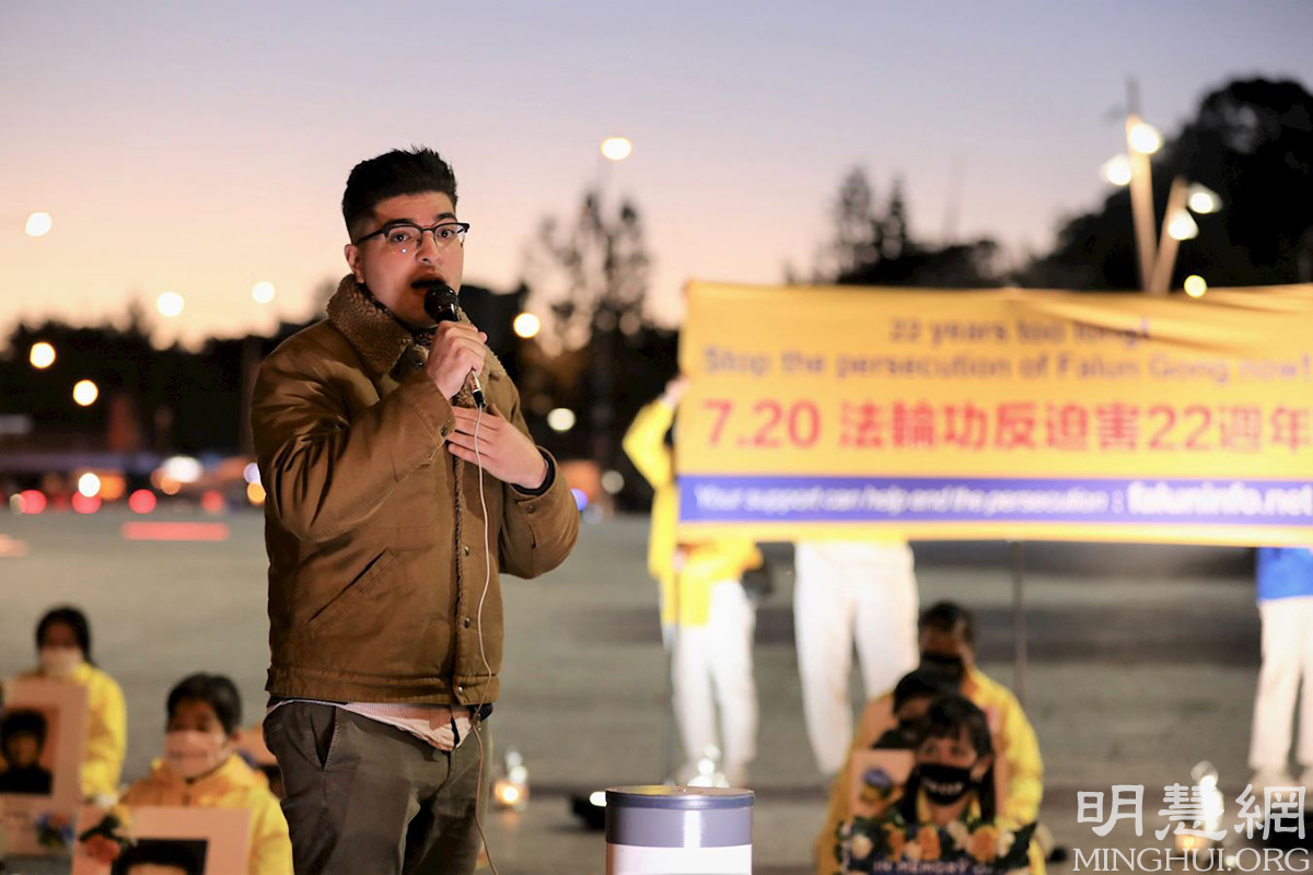 ![]() 图5:德鲁·帕夫洛在烛光悼念活动上发言中说:“看到法轮功学员坚持不懈地反迫害,令我感动,我将永远与你们站在一起。” |
